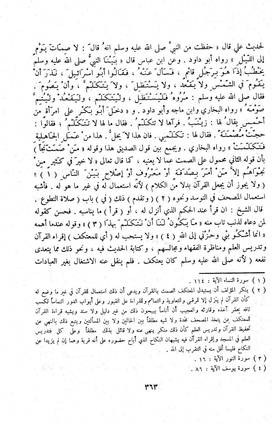 " وَدَخَلَ أَبُو بَكْرٍ عَلَى امْرَأَةٍ مِنْ أَحْمَسَ يُقَالُ لَهَا: زَيْنَبُ فَرَآهَا لَا تَتَكَلَّمُ فَقَالَ: مَا لَهَا لَا تَتَكَلَّمُ؟ فَقَالُوا: حَجَّتْ مُصْمَتَةً فَقَالَ لَهَا: تَكَلَّمِي فَإِنَّ هَذَا لَا يَحِلُّ هَذَا مِنْ عَمَلِ الْجَاهِلِيَّةِ فَتَكَلَّمَتْ رَوَاهُ الْبُخَارِيُّ، وَيُجْمَعُ بَيْنَ قَوْلِ الصِّدِّيقِ هَذَا وَقَوْلِهِ: «مَنْ صَمَتَ نَجَا» بِأَنَّ قَوْلَهُ الثَّانِيَ مَحْمُولٌ عَلَى الصَّمْتِ عَمَّا لَا يَعْنِيهِ كَمَا قَالَ تَعَالَى {لا خَيْرَ فِي كَثِيرٍ مِنْ نَجْوَاهُمْ إِلا مَنْ أَمَرَ بِصَدَقَةٍ أَوْ مَعْرُوفٍ أَوْ إِصْلاحٍ بَيْنَ النَّاسِ} [النساء: ١١٤] .