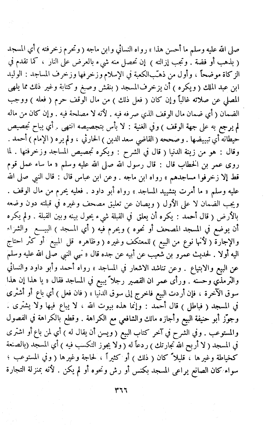 (وَفِي الْغُنْيَةِ: لَا بَأْسَ بِتَجْصِيصِهِ انْتَهَى أَيْ: يُبَاحُ تَجْصِيصُ حِيطَانِهِ أَيْ: تَبْيِيضُهَا، وَصَحَّحَهُ الْقَاضِي سَعْدُ الدِّينِ الْحَارِثِيُّ وَلَمْ يَرَهُ) الْإِمَامُ (أَحْمَدُ وَقَالَ: هُوَ مِنْ زِينَةِ الدُّنْيَا) قَالَ فِي الشَّرْحِ: وَيُكْرَهُ تَجْصِيصُ الْمَسَاجِدِ وَزَخْرَفَتُهَا لِمَا رَوَى عُمَرُ بْنُ الْخَطَّابِ قَالَ: قَالَ رَسُولُ اللَّهِ - صَلَّى اللَّهُ عَلَيْهِ وَسَلَّمَ -: «مَا سَاءَ عَمَلُ قَوْمٍ قَطُّ إلَّا زَخْرَفُوا مَسَاجِدَهُمْ» رَوَاهُ ابْنُ مَاجَهْ.