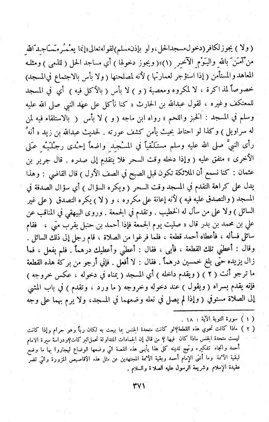 (دُخُولُ مَسْجِدِ الْحِلِّ وَلَوْ بِإِذْنِ مُسْلِمٍ) لِقَوْلِهِ تَعَالَى {إِنَّمَا يَعْمُرُ مَسَاجِدَ اللَّهِ مَنْ آمَنَ بِاللَّهِ وَالْيَوْمِ الآخِرِ} [التوبة: ١٨] .