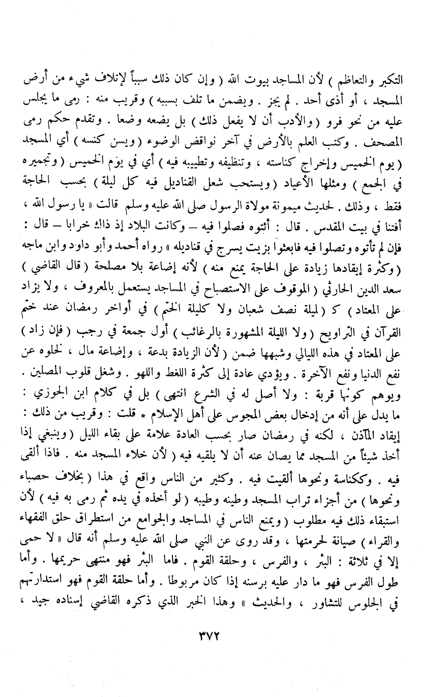 (وَكَثْرَةُ إيقَادِهَا زِيَادَةً عَلَى الْحَاجَةِ يُمْنَعُ مِنْهُ) ؛ لِأَنَّهُ إضَاعَةٌ بِلَا مَصْلَحَةٍ قَالَ الْقَاضِي سَعْدُ الدِّينِ الْحَارِثِيُّ: (الْمَوْقُوفُ عَلَى الِاسْتِصْبَاحِ فِي الْمَسَاجِدِ يُسْتَعْمَلُ بِالْمَعْرُوفِ وَلَا يُزَادُ عَلَى الْمُعْتَادِ) كَ (لَيْلَةِ نِصْفِ شَعْبَانَ وَلَا كَلَيْلَةِ الْخَتْمِ) فِي أَوَاخِرِ رَمَضَانَ عِنْدَ خَتْمِ الْقُرْآنِ فِي التَّرَاوِيحِ.