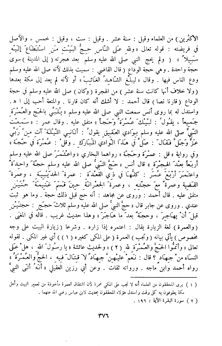 وَفِي رِوَايَةٍ «قُلْ: عُمْرَةٌ وَحَجَّةٌ» رَوَاهُمَا الْبُخَارِيُّ «وَاعْتَمَرَ - صَلَّى اللَّهُ عَلَيْهِ وَسَلَّمَ - أَرْبَعًا بَعْدَ الْهِجْرَةِ» قَالَ أَنَسٌ: «حَجَّ النَّبِيُّ - صَلَّى اللَّهُ عَلَيْهِ وَسَلَّمَ - حَجَّةً وَاحِدَةً وَاعْتَمَرَ أَرْبَعَ عُمَرَ كُلُّهَا فِي ذِي الْقَعْدَةِ: عُمْرَةَ الْحُدَيْبِيَةِ وَعُمْرَةَ الْقَضِيَّةِ وَعُمْرَةً مَعَ حَجَّتِهِ وَعُمْرَةَ الْجِعْرَانَةِ حِينَ قَسَمَ غَنِيمَةَ حُنَيْنٍ» مُتَّفَقٌ عَلَيْهِ.