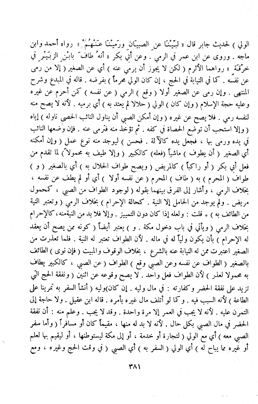 وَرُوِيَ عَنْ ابْنِ عُمَرَ فِي الرَّمْي وَعَنْ أَبِي بَكْرٍ أَنَّهُ طَافَ بِابْنِ الزُّبَيْرِ فِي خِرْقَةٍ " رَوَاهُمَا الْأَثْرَمُ، (لَكِنْ لَا يَجُوزُ أَنْ يَرْمِيَ عَنْهُ) أَيْ: عَنْ الصَّغِيرِ (إلَّا مَنْ رَمَى عَنْ نَفْسِهِ كَمَا فِي النِّيَابَةِ فِي الْحَجِّ وَإِنْ كَانَ الْوَلِيُّ مُحْرِمًا) بِفَرْضِهِ قَالَهُ فِي الْمُبْدِعِ وَشَرْحِ الْمُنْتَهَى، وَإِنْ رَمَى عَنْ الصَّغِيرِ أَوَّلًا (وَقَعَ) الرَّمْيُ (عَنْ نَفْسِهِ) كَمَنْ أَحْرَمَ عَنْ غَيْرِهِ وَعَلَيْهِ حَجَّةُ الْإِسْلَامِ (الْإِسْلَامِ وَإِنْ كَانَ) الْوَلِيُّ (حَلَالًا لَمْ يُعْتَدَّ بِهِ) أَيْ: بِرَمْيِهِ؛ لِأَنَّهُ لَا يَصِحُّ مِنْهُ لِنَفْسِهِ رَمْيٌ فَلَا يَصِحُّ عَنْ غَيْرِهِ.