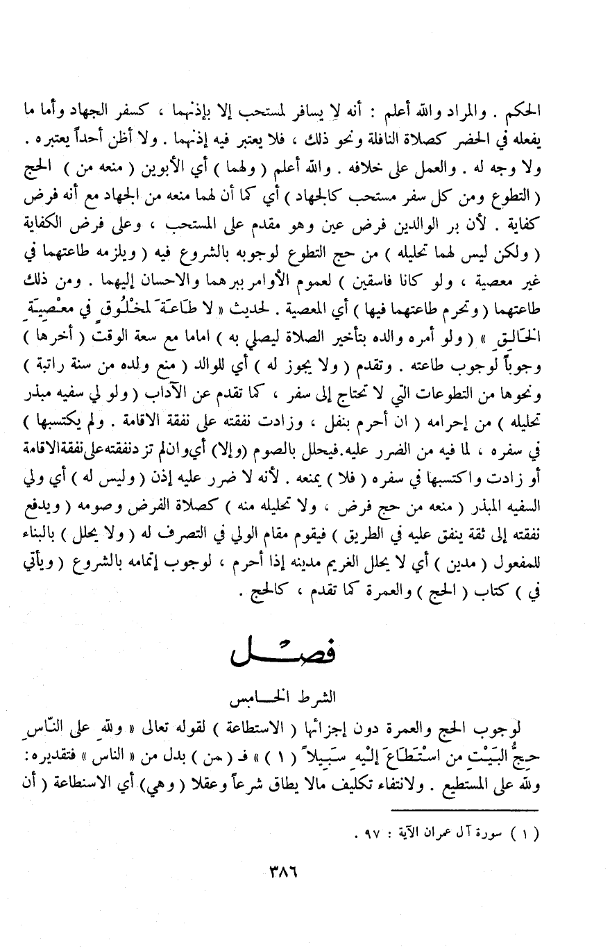 لِقَوْلِهِ تَعَالَى {وَلِلَّهِ عَلَى النَّاسِ حِجُّ الْبَيْتِ مَنِ اسْتَطَاعَ إِلَيْهِ سَبِيلا} [آل عمران: ٩٧] فَ (مَنْ) " بَدَلٌ مِنْ النَّاسِ " فَتَقْدِيرُهُ: وَلِلَّهِ عَلَى الْمُسْتَطِيعِ وَلِانْتِفَاءِ تَكْلِيفِ مَا لَا يُطَاقُ شَرْعًا وَعَقْلًا (وَهِيَ) أَيْ: الِاسْتِطَاعَةُ (أَنْ
