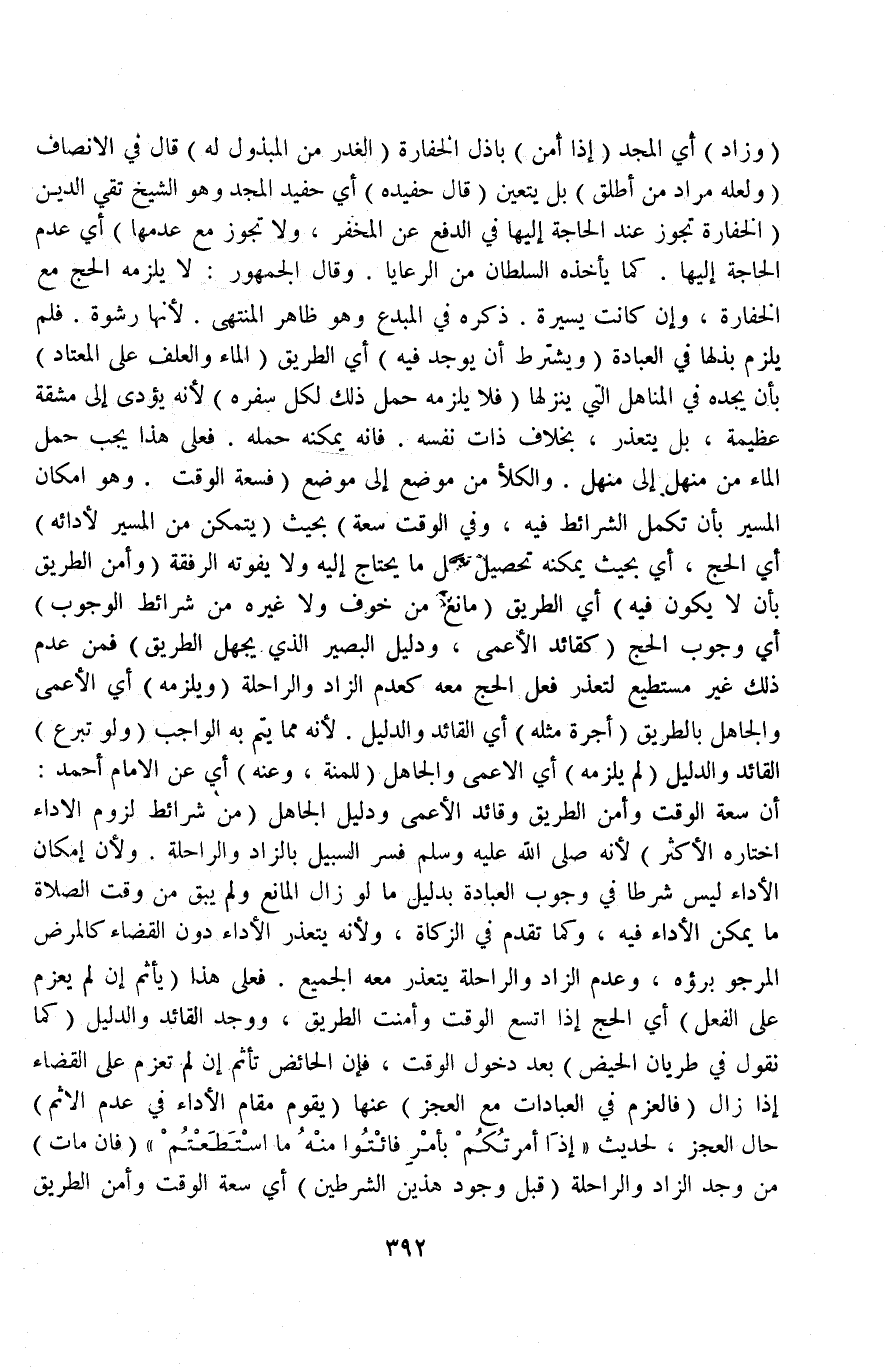 وَقَالَ الْجُمْهُورُ: لَا يَلْزَمُهُ الْحَجُّ مَعَ الْخَفَارَةِ وَإِنْ كَانَتْ يَسِيرَةً ذَكَرَهُ فِي الْمُبْدِعِ وَهُوَ ظَاهِرُ الْمُنْتَهَى؛ لِأَنَّهَا رِشْوَةٌ فَلَمْ يَلْزَمْ بَذْلُهَا فِي الْعِبَادَةِ (وَيُشْتَرَطُ أَنْ يُوجَدَ فِيهِ) أَيْ: الطَّرِيقِ (الْمَاءُ وَالْعَلَفُ عَلَى الْمُعْتَادِ) بِأَنْ يَجِدَهُ فِي الْمَنَاهِلِ الَّتِي يَنْزِلُهَا (فَلَا يَلْزَمُهُ حَمْلُ ذَلِكَ لِكُلِّ سَفْرَةٍ) ؛ لِأَنَّهُ يُؤَدِّي إلَى مَشَقَّةٍ عَظِيمَةٍ بَلْ يَتَعَذَّرُ بِخِلَافِ ذَاتِ نَفْسِهِ، فَإِنَّهُ يُمْكِنُهُ حَمْلُهُ فَعَلَى هَذَا يَجِبُ حَمْلُ الْمَاءِ مِنْ مَنْهَلٍ إلَى مَنْهَلٍ وَالْكَلَأَ مِنْ مَوْضِعٍ إلَى مَوْضِعٍ (فَسَعَةُ الْوَقْتِ هِيَ وَإِمْكَانُ الْمَسِيرِ بِأَنْ تَكْمُلَ الشَّرَائِطُ فِيهِ، وَفِي الْوَقْتِ سَعَةٌ) بِحَيْثُ (يَتَمَكَّنْ مِنْ الْمَسِيرِ لِأَدَائِهِ) أَيْ: الْحَجِّ أَيْ: بِحَيْثُ يُمْكِنْهُ تَحْصِيلُ مَا يَحْتَاجُ إلَيْهِ، وَلَا يَفُوتُهُ الرُّفْقَةُ.