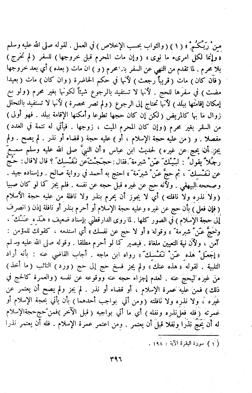 (وَمَنْ عَلَيْهِ حَجَّةُ الْإِسْلَامِ أَوْ) عَلَيْهِ حَجَّةُ قَضَاءٍ أَوْ نَذْرٍ لَمْ يَصِحَّ وَلَمْ يَجُزْ أَنْ يَحُجَّ عَنْ غَيْرِهِ لِحَدِيثِ ابْنِ عَبَّاسٍ «أَنَّ النَّبِيَّ - صَلَّى اللَّهُ عَلَيْهِ وَسَلَّمَ - سَمِعَ رَجُلًا يَقُولُ: لَبَّيْكَ عَنْ شُبْرُمَةَ فَقَالَ: حَجَجْتَ عَنْ نَفْسِكَ؟ قَالَ: لَا قَالَ: حُجَّ عَنْ نَفْسِكَ ثُمَّ حُجَّ عَنْ شُبْرُمَةَ» احْتَجَّ بِهِ أَحْمَدُ فِي رِوَايَةِ صَالِحٍ وَإِسْنَادُهُ جَيِّدٌ وَصَحَّحَهُ الْبَيْهَقِيُّ؛ وَلِأَنَّهُ حَجَّ عَنْ غَيْرِهِ قَبْلَ حَجِّهِ عَنْ نَفْسِهِ فَلَمْ يَجُزْ كَمَا لَوْ كَانَ صَبِيًّا، (وَلَا نَذْرُهُ وَلَا نَافِلَتُهُ) أَيْ: لَا يَجُوزُ أَنْ يُحْرِمَ بِنَذْرٍ وَلَا نَافِلَةٍ مَنْ عَلَيْهِ حَجَّةُ الْإِسْلَامِ.