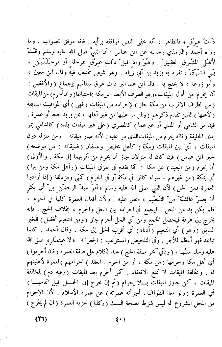 ذَاتَ عِرْقٍ " فَالظَّاهِرُ: أَنَّهُ خَفِيَ النَّصُّ فَوَافَقَهُ بِرَأْيِهِ فَإِنَّهُ مُوَافِقٌ لِلصَّوَابِ وَمَا رَوَاهُ أَحْمَدُ وَالتِّرْمِذِيُّ وَحَسَّنَهُ عَنْ ابْنِ عَبَّاسٍ «أَنَّ النَّبِيَّ - صَلَّى اللَّهُ عَلَيْهِ وَسَلَّمَ - وَقَّتَ لِأَهْلِ الْمَشْرِقِ الْعَقِيقَ وَهُوَ وَادٍ قَبْلَ ذَاتِ عِرْقٍ بِمَرْحَلَةٍ أَوْ مَرْحَلَتَيْنِ يَلِي الشَّرْقَ» تَفَرَّدَ بِهِ يَزِيدُ بْنُ أَبِي زِيَادٍ وَهُوَ شِيعِيٌّ مُخْتَلَفٌ فِيهِ وَقَالَ ابْنُ مَعِينٍ وَأَبُو زُرْعَةَ: لَا يُحْتَجُّ بِهِ.