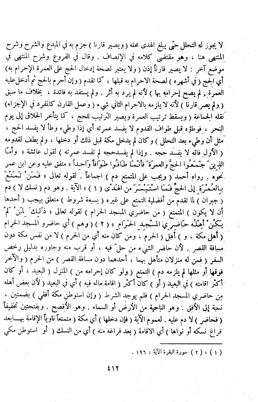 (وَيَجِبُ عَلَى الْمُتَمَتِّعِ دَمٌ) إجْمَاعًا لِقَوْلِهِ تَعَالَى: {فَمَنْ تَمَتَّعَ بِالْعُمْرَةِ إِلَى الْحَجِّ فَمَا اسْتَيْسَرَ مِنَ الْهَدْيِ} [البقرة: ١٩٦] وَهُوَ دَمُ (نُسُكٍ لَا) دَمَ (جُبْرَانٍ) لِمَا تَقَدَّمَ مِنْ أَفْضَلِيَّةِ التَّمَتُّعِ عَلَى غَيْرِهِ (بِسَبْعَةِ شُرُوطٍ) مُتَعَلِّقٌ بِيَجِبُ (أَحَدهَا أَنْ لَا يَكُونَ) الْمُتَمَتِّعُ (مِنْ حَاضِرِي الْمَسْجِدِ الْحَرَامِ) لِقَوْلِهِ تَعَالَى: {ذَلِكَ لِمَنْ لَمْ يَكُنْ أَهْلُهُ حَاضِرِي الْمَسْجِدِ الْحَرَامِ} [البقرة: ١٩٦] (وَهُمْ) أَيْ: حَاضِرُو الْمَسْجِدِ الْحَرَامِ (أَهْلُ مَكَّةَ وَ) أَهْلُ (الْحَرَمِ وَمَنْ كَانَ مِنْهُ أَيْ: مِنْ الْحَرَمِ) لَا مِنْ نَفْسِ مَكَّةَ دُون مَسَافَةِ الْقَصْرِ؛ لِأَنَّ حَاضَرَ الشَّيْءِ مَنْ حَلَّ فِيهِ أَوْ قَرُبَ مِنْهُ وَجَاوَرَهُ بِدَلِيلِ رُخَصِ السَّفَرِ (فَمَنْ لَهُ مَنْزِلَانِ مُتَأَهِّلٌ بِهِمَا، أَحَدُهُمَا دُونَ مَسَافَةِ الْقَصْرِ) مِنْ الْحَرَمِ (وَالْآخَرُ فَوْقَهَا أَوْ مِثْلَهَا لَمْ يَلْزَمْهُ دَمُ) التَّمَتُّعِ.