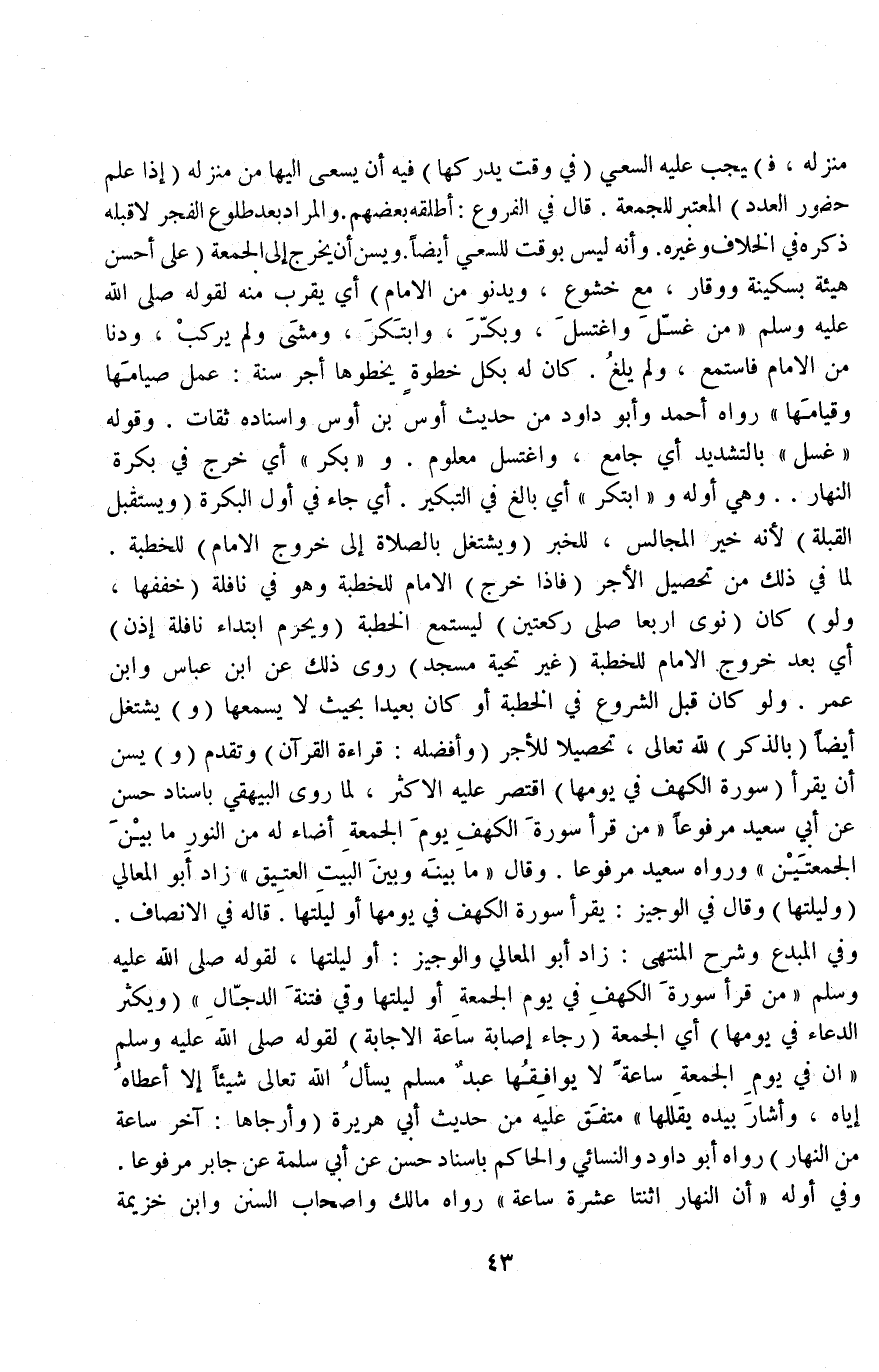 (وَ) يُسَنُّ أَنْ (يَقْرَأَ سُورَةَ الْكَهْفِ فِي يَوْمِهَا) اقْتَصَرَ عَلَيْهِ الْأَكْثَرُ، لِمَا رَوَى الْبَيْهَقِيُّ بِإِسْنَادٍ حَسَنٍ عَنْ أَبِي سَعِيدٍ مَرْفُوعًا «مَنْ قَرَأَ سُورَةَ الْكَهْفِ يَوْمَ الْجُمُعَةِ أَضَاءَ لَهُ مِنْ النُّورِ مَا بَيْنَ الْجُمُعَتَيْنِ وَرَوَاهُ سَعِيدٌ مَرْفُوعًا وَقَالَ» مَا بَيْنَهُ وَبَيْنَ الْبَيْتِ الْعَتِيقِ زَادَ أَبُو الْمَعَالِي (وَلَيْلَتَهَا) وَقَالَ فِي الْوَجِيزِ: يَقْرَأُ سُورَةَ الْكَهْفِ فِي يَوْمِهَا أَوْ لَيْلَتِهَا قَالَهُ فِي الْإِنْصَافِ.