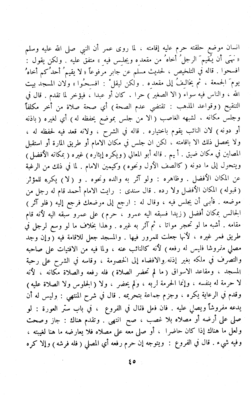 إنْسَانٌ مَوْضِعَ حَلْقَتِهِ حَرُمَ عَلَيْهِ إقَامَتُهُ، لِمَا رَوَى عُمَرُ أَنَّ النَّبِيَّ - صَلَّى اللَّهُ عَلَيْهِ وَسَلَّمَ - «نَهَى أَنْ يُقِيمَ الرَّجُلُ أَخَاهُ مِنْ مَقْعَدِهِ وَيَجْلِسَ فِيهِ» مُتَّفَقٌ عَلَيْهِ وَلَكِنْ يَقُولُ: افْسَحُوا قَالَهُ فِي التَّلْخِيصِ، لِحَدِيثِ مُسْلِمٍ عَنْ جَابِرٍ مَرْفُوعًا «لَا يُقِيمُ أَحَدُكُمْ أَخَاهُ يَوْمَ الْجُمُعَةِ، ثُمَّ يُخَالِفُ إلَى مَقْعَدِهِ وَلَكِنْ لِيَقُلْ: افْسَحُوا» وَلِأَنَّ الْمَسْجِدَ بَيْتُ اللَّهِ، وَالنَّاسُ فِيهِ سَوَاءٌ (إلَّا الصَّغِيرَ) حُرًّا، كَانَ أَوْ عَبْدًا، فَيُؤَخَّرُ لِمَا تَقَدَّمَ قَالَ فِي التَّنْقِيحِ.