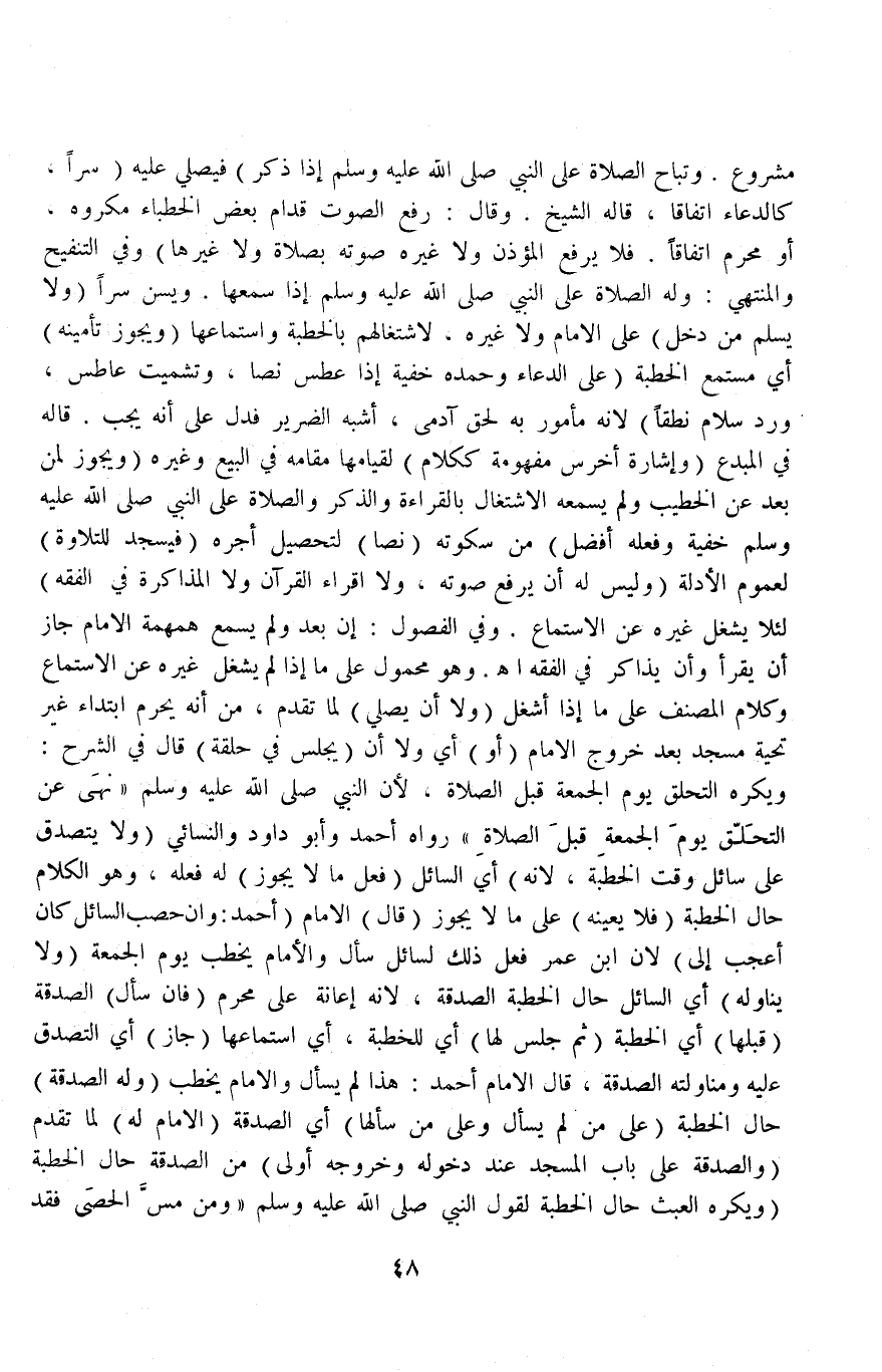 مَشْرُوعٍ وَتُبَاحُ الصَّلَاةُ عَلَى النَّبِيِّ - صَلَّى اللَّهُ عَلَيْهِ وَسَلَّمَ - إذَا ذُكِرَ) فَيُصَلِّي عَلَيْهِ (سِرًّا، كَالدُّعَاءِ اتِّفَاقًا، قَالَهُ الشَّيْخُ وَقَالَ: رَفْعُ الصَّوْتِ قُدَّامَ بَعْضِ الْخُطَبَاءِ مَكْرُوهٌ، أَوْ مُحَرَّمٌ اتِّفَاقًا فَلَا يَرْفَعُ الْمُؤَذِّنُ وَلَا غَيْرُهُ صَوْتَهُ بِصَلَاةٍ وَلَا غَيْرِهَا) .