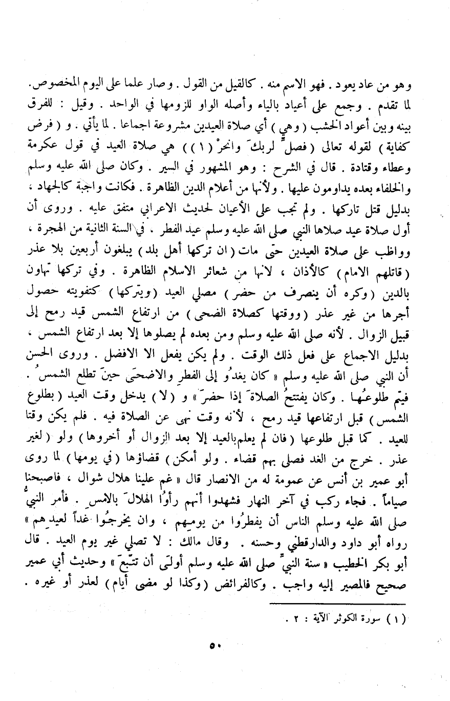 وَهُوَ مِنْ عَادَ يَعُودُ فَهُوَ الِاسْمُ مِنْهُ كَالْقِيلِ مِنْ الْقَوْلِ وَصَارَ عَلَمًا عَلَى الْيَوْمِ الْمَخْصُوصِ لِمَا تَقَدَّمَ وَجُمِعَ عَلَى أَعْيَادٍ بِالْيَاءِ وَأَصْلُهُ الْوَاوُ لِلُزُومِهَا فِي الْوَاحِدِ وَقِيلَ: لِلْفَرْقِ بَيْنَهُ وَبَيْنَ أَعْوَادِ الْخَشَبِ (وَهِيَ) أَيْ صَلَاةُ الْعِيدَيْنِ مَشْرُوعَةٌ إجْمَاعًا لِمَا يَأْتِي وَ (فَرْضُ كِفَايَةٍ) لِقَوْلِهِ تَعَالَى {فَصَلِّ لِرَبِّكَ وَانْحَرْ} [الكوثر: ٢] هِيَ صَلَاةُ الْعِيدِ فِي قَوْلِ عِكْرِمَةَ وَعَطَاءٍ وَقَتَادَةَ قَالَ فِي الشَّرْحِ: وَهُوَ الْمَشْهُورُ فِي السِّيَرِ وَكَانَ - صَلَّى اللَّهُ عَلَيْهِ وَسَلَّمَ - وَالْخُلَفَاءُ بَعْدَهُ يُدَاوِمُونَ عَلَيْهَا وَلِأَنَّهَا مِنْ أَعْلَامِ الدِّينِ الظَّاهِرَةِ فَكَانَتْ وَاجِبَةً كَالْجِهَادِ، بِدَلِيلِ قَتْلِ تَارِكِهَا وَلَمْ تَجِبْ عَلَى الْأَعْيَانِ لِحَدِيثِ الْأَعْرَابِيِّ مُتَّفَقٌ عَلَيْهِ وَرُوِيَ أَنَّ أَوَّلَ صَلَاةِ عِيدٍ صَلَّاهَا النَّبِيُّ عِيدُ الْفِطْرِ، فِي السَّنَةِ الثَّانِيَةِ مِنْ الْهِجْرَةِ، وَوَاظَبَ عَلَى صَلَاةِ الْعِيدَيْنِ حَتَّى مَاتَ (إنْ تَرَكَهَا أَهْلُ بَلَدٍ) يَبْلُغُونَ أَرْبَعِينَ بِلَا عُذْرٍ (قَاتَلَهُمْ الْإِمَامُ) كَالْأَذَانِ، لِأَنَّهَا مِنْ شَعَائِرِ الْإِسْلَامِ الظَّاهِرَةِ وَفِي تَرْكِهَا تَهَاوُنٌ بِالدِّينِ.