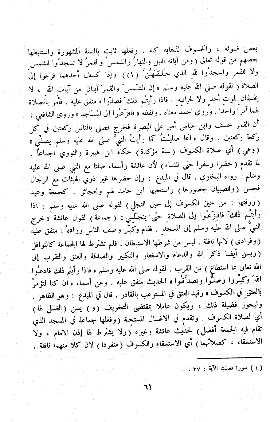بَعْضِ ضَوْئِهِ، وَالْخُسُوفُ لِذَهَابِهِ كُلِّهِ وَفِعْلُهَا ثَابِتٌ بِالسُّنَّةِ الْمَشْهُورَةِ اسْتَنْبَطَهَا بَعْضُهُمْ مِنْ قَوْله تَعَالَى {وَمِنْ آيَاتِهِ اللَّيْلُ وَالنَّهَارُ وَالشَّمْسُ وَالْقَمَرُ لا تَسْجُدُوا لِلشَّمْسِ وَلا لِلْقَمَرِ وَاسْجُدُوا لِلَّهِ الَّذِي خَلَقَهُنَّ} [فصلت: ٣٧] (وَإِذَا كَسَفَ أَحَدُهُمَا فَزِعُوا إلَى الصَّلَاةِ) لِقَوْلِهِ - صَلَّى اللَّهُ عَلَيْهِ وَسَلَّمَ - «إنَّ الشَّمْسَ وَالْقَمَرَ آيَتَانِ مِنْ آيَاتِ اللَّهِ، لَا يَخْسِفَانِ لِمَوْتِ أَحَدٍ وَلَا لِحَيَاتِهِ فَإِذَا رَأَيْتُمْ ذَلِكَ فَصَلُّوا» مُتَّفَقٌ عَلَيْهِ فَأَمَرَ بِالصَّلَاةِ لَهُمَا أَمْرًا وَاحِدًا وَرَوَى أَحْمَدُ مَعْنَاهُ وَلَفْظُهُ «فَافْزَعُوا إلَى الْمَسَاجِدِ» .