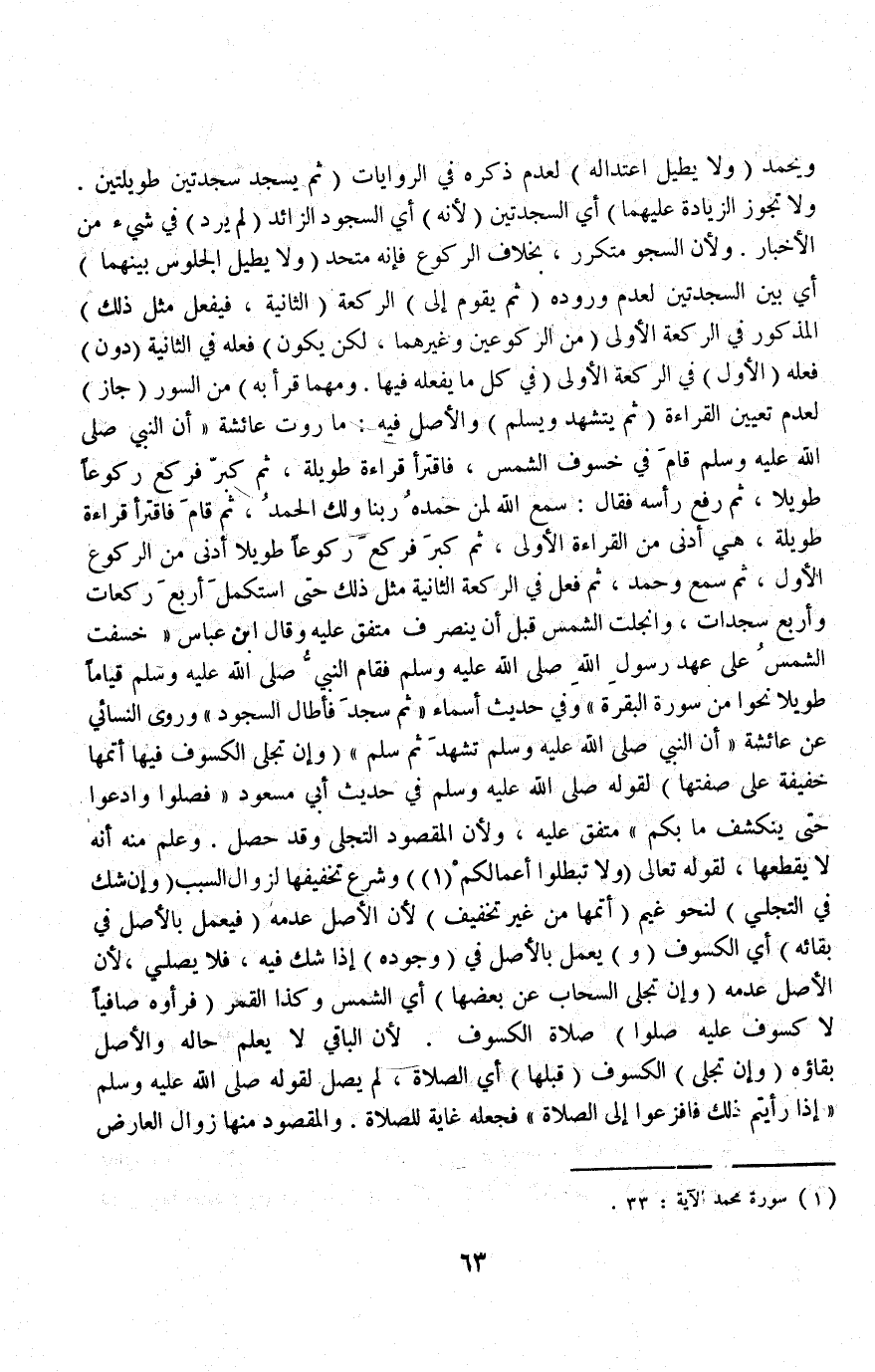 وَرَوَى النَّسَائِيُّ عَنْ عَائِشَةَ «أَنَّ النَّبِيَّ - صَلَّى اللَّهُ عَلَيْهِ وَسَلَّمَ - تَشَهَّدَ ثُمَّ سَلَّمَ» (وَإِنْ تَجَلَّى الْكُسُوفُ فِيهَا أَتَمَّهَا خَفِيفَةً عَلَى صِفَتِهَا) لِقَوْلِهِ - صَلَّى اللَّهُ عَلَيْهِ وَسَلَّمَ - فِي حَدِيثِ أَبِي مَسْعُودٍ «فَصَلُّوا وَادْعُوا حَتَّى يَنْكَشِفَ مَا بِكُمْ» مُتَّفَقٌ عَلَيْهِ؛ وَلِأَنَّ الْمَقْصُودَ التَّجَلِّي وَقَدْ حَصَلَ، وَعُلِمَ مِنْهُ أَنَّهُ لَا يَقْطَعُهَا؛ لِقَوْلِهِ تَعَالَى {وَلا تُبْطِلُوا أَعْمَالَكُمْ} [محمد: ٣٣] .
