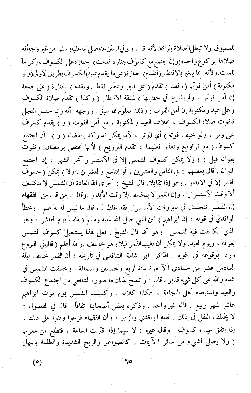 قَالَ فِي الْفُرُوعِ وَرُدَّ بِوُقُوعِهِ فِي غَيْرِهِ فَذَكَرَ أَبُو شَامَةَ الشَّافِعِيُّ فِي تَارِيخِهِ: أَنَّ الْقَمَرَ خَسَفَ لَيْلَةَ السَّادِسَ عَشَرَ مِنْ جُمَادَى الْآخِرَةِ سَنَةَ أَرْبَعٍ وَخَمْسِينَ وَسِتِّ مِائَةٍ وَخَسَفَتْ الشَّمْسُ فِي غَدِهِ وَاَللَّهُ عَلَى كُلِّ شَيْءٍ قَدِيرٌ قَالَ: وَاتَّضَحَ بِذَلِكَ مَا صَوَّرَهُ الشَّافِعِيُّ مِنْ اجْتِمَاعِ الْكُسُوفِ وَالْعِيدِ وَاسْتَبْعَدَهُ أَهْلُ النَّجَّامَةِ، هَكَذَا كَلَامُهُ وَكَسَفَتْ الشَّمْسُ يَوْمَ مَوْتِ إبْرَاهِيمَ عَاشِرَ شَهْرِ رَبِيعٍ قَالَهُ غَيْرُ وَاحِدٍ وَذَكَرَهُ بَعْضُ أَصْحَابِنَا اتِّفَاقًا قَالَ فِي الْفُصُولِ: لَا يَخْتَلِفُ النَّقْلُ فِي ذَلِكَ نَقَلَهُ الْوَاقِدِيُّ وَالزُّبَيْرُ وَإِنَّ الْفُقَهَاءَ فَرَّعُوا وَبَنَوْا عَلَى ذَلِكَ: إذَا اتَّفَقَ عِيدٌ وَكُسُوفٌ وَقَالَ غَيْرُهُ: لَا سِيَّمَا إذَا اقْتَرَبَتْ السَّاعَةُ، فَتَطْلُعُ مِنْ مَغْرِبِهَا.