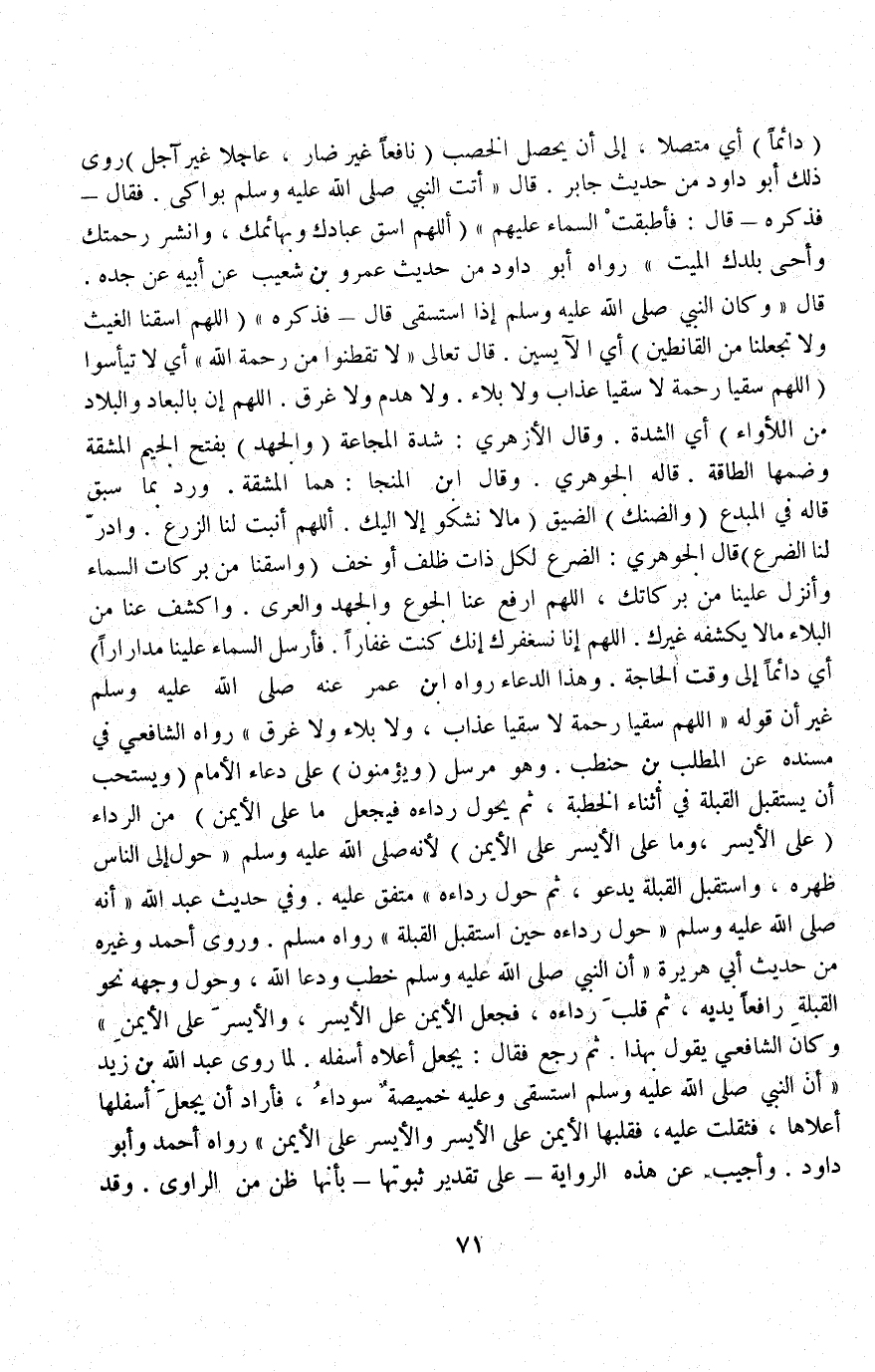 (وَالضَّنْكِ) الضِّيقُ «مَا لَا نَشْكُو إلَّا إلَيْك اللَّهُمَّ أَنْبِتْ لَنَا الزَّرْعَ وَأَدِرَّ لَنَا الضَّرْعَ» ) قَالَ الْجَوْهَرِيُّ: الضَّرْعُ لِكُلِّ ذَاتِ ظِلْفٍ أَوْ خُفٍّ «وَاسْقِنَا مِنْ بَرَكَاتِ السَّمَاءِ وَأَنْزِلْ عَلَيْنَا مِنْ بَرَكَاتِك، اللَّهُمَّ ارْفَعْ عَنَّا الْجُوعَ وَالْجَهْدَ وَالْعُرْيَ وَاكْشِفْ عَنَّا مِنْ الْبَلَاءِ مَا لَا يَكْشِفُهُ غَيْرُك اللَّهُمَّ إنَّا نَسْتَغْفِرُك إنَّك كُنْت غَفَّارًا فَأَرْسِلْ السَّمَاءَ عَلَيْنَا مِدْرَارًا» أَيْ دَائِمًا إلَى وَقْتِ الْحَاجَةِ وَهَذَا الدُّعَاءُ رَوَاهُ ابْنُ عُمَرَ عَنْهُ - صَلَّى اللَّهُ عَلَيْهِ وَسَلَّمَ - غَيْرَ أَنَّ قَوْلَهُ «اللَّهُمَّ سُقْيَا رَحْمَةٍ لَا سُقْيَا عَذَابٍ، وَلَا بَلَاءٍ وَلَا غَرَقٍ» رَوَاهُ الشَّافِعِيُّ فِي مُسْنَدِهِ عَنْ الْمُطَّلِبِ بْنِ حَنْطَبٍ وَهُوَ مُرْسَلٌ.