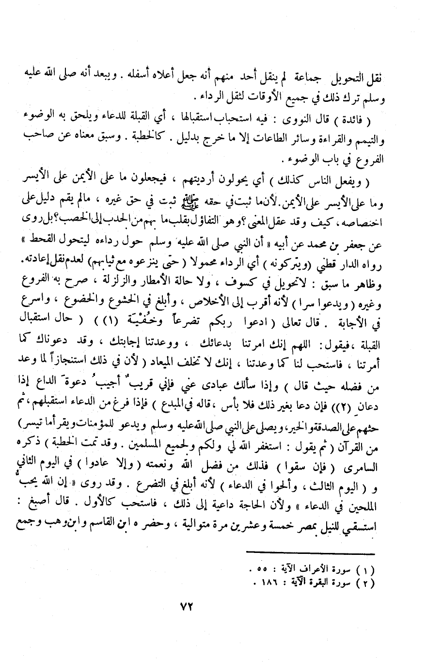 نَقَلَ التَّحْوِيلَ جَمَاعَةٌ لَمْ يَنْقُلْ أَحَدٌ مِنْهُمْ أَنَّهُ جَعَلَ أَعْلَاهُ أَسْفَلَهُ وَيَبْعُدُ أَنَّهُ - صَلَّى اللَّهُ عَلَيْهِ وَسَلَّمَ - تَرَكَ ذَلِكَ فِي جَمِيعِ الْأَوْقَاتِ لِثِقَلِ الرِّدَاءِ فَائِدَةٌ قَالَ النَّوَوِيُّ: فِيهِ اسْتِحْبَابُ اسْتِقْبَالِهَا، أَيْ الْقِبْلَةِ لِلدُّعَاءِ وَيُلْحَقُ بِهِ الْوُضُوءُ وَالتَّيَمُّمُ وَالْقِرَاءَةُ وَسَائِرُ الطَّاعَاتِ إلَّا مَا خَرَجَ بِدَلِيلٍ كَالْخُطْبَةِ وَسَبَقَ مَعْنَاهُ عَنْ صَاحِبِ الْفُرُوعِ فِي بَابِ الْوُضُوءِ.