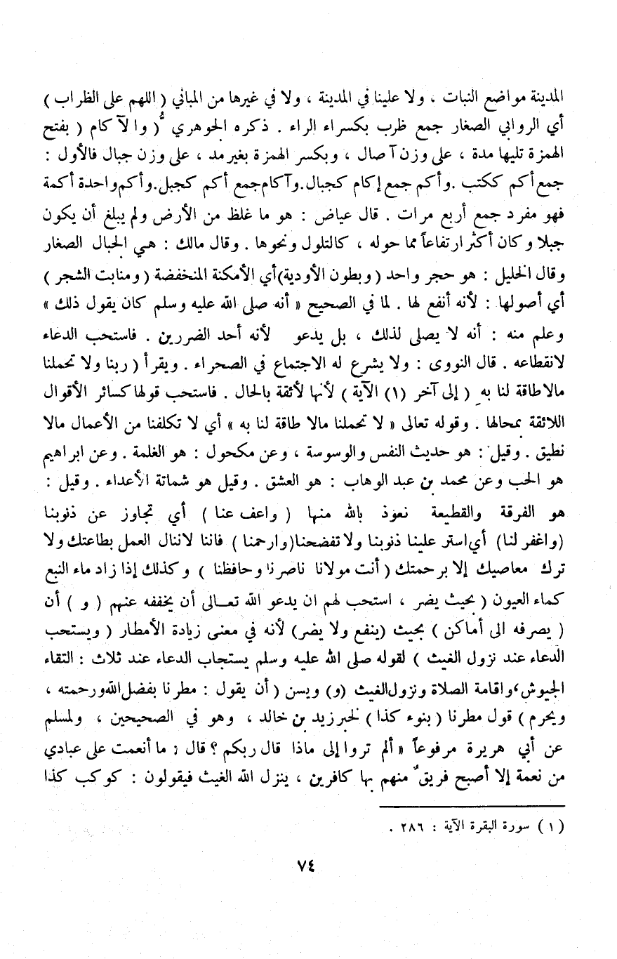 (وَالْآكَامِ) بِفَتْحِ الْهَمْزَةِ تَلِيهَا مَدَّةٌ عَلَى وَزْنِ آصَالٍ وَبِكَسْرِ الْهَمْزَةِ بِغَيْرِ مَدٍّ عَلَى وَزْنِ جِبَالٍ فَالْأَوَّلُ جَمْعُ أُكُمٍ كَكُتُبٍ وَأُكُمٌ جَمْعُ إكَامٍ كَجِبَالٍ وَآكَامٌ جَمْعُ أُكُمٍ كَجَبَلٍ وَأُكُمٌ وَاحِدُهُ أَكَمَةٌ فَهُوَ مُفْرَدٌ جُمِعَ أَرْبَعَ مَرَّاتٍ قَالَ عِيَاضٌ: هُوَ مَا غَلُظَ مِنْ الْأَرْضِ وَلَمْ يَبْلُغْ أَنْ يَكُونَ، جَبَلًا وَكَانَ أَكْثَرَ ارْتِفَاعًا مِمَّا حَوْلَهُ، كَالتُّلُولِ وَنَحْوِهَا وَقَالَ مَالِكٌ: هِيَ الْجِبَالُ الصِّغَارُ وَقَالَ الْخَلِيلُ: هُوَ حَجَرٌ وَاحِدٌ (وَبُطُونِ الْأَوْدِيَةِ) أَيْ الْأَمْكِنَةِ الْمُنْخَفِضَةِ (وَمَنَابِتِ الشَّجَرِ) أَيْ أُصُولِهَا لِأَنَّهُ أَنْفَعُ لَهَا لِمَا فِي الصَّحِيحِ أَنَّهُ - صَلَّى اللَّهُ عَلَيْهِ وَسَلَّمَ - كَانَ يَقُولُ ذَلِكَ وَعُلِمَ مِنْهُ أَنَّهُ لَا يُصَلَّى لِذَلِكَ، بَلْ يَدْعُو لِأَنَّهُ أَحَدُ الضَّرَرَيْنِ فَاسْتُحِبَّ الدُّعَاءُ لِانْقِطَاعِهِ قَالَ النَّوَوِيُّ: وَلَا يُشْرَعُ لَهُ الِاجْتِمَاعُ فِي الصَّحْرَاءِ وَيَقْرَأُ {رَبَّنَا وَلا تُحَمِّلْنَا مَا لا طَاقَةَ لَنَا بِهِ} [البقرة: ٢٨٦] إلَى آخِرِ الْآيَةِ) لِأَنَّهَا لَائِقَةٌ بِالْحَالِ فَاسْتُحِبَّ قَوْلُهَا كَسَائِرِ الْأَقْوَالِ اللَّائِقَةِ بِمَحَالِّهَا وقَوْله تَعَالَى {رَبَّنَا وَلا تُحَمِّلْنَا مَا لا طَاقَةَ لَنَا بِهِ} [البقرة: ٢٨٦] أَيْ لَا تُكَلِّفْنَا مِنْ الْأَعْمَالِ مَا لَا نُطِيقُ.