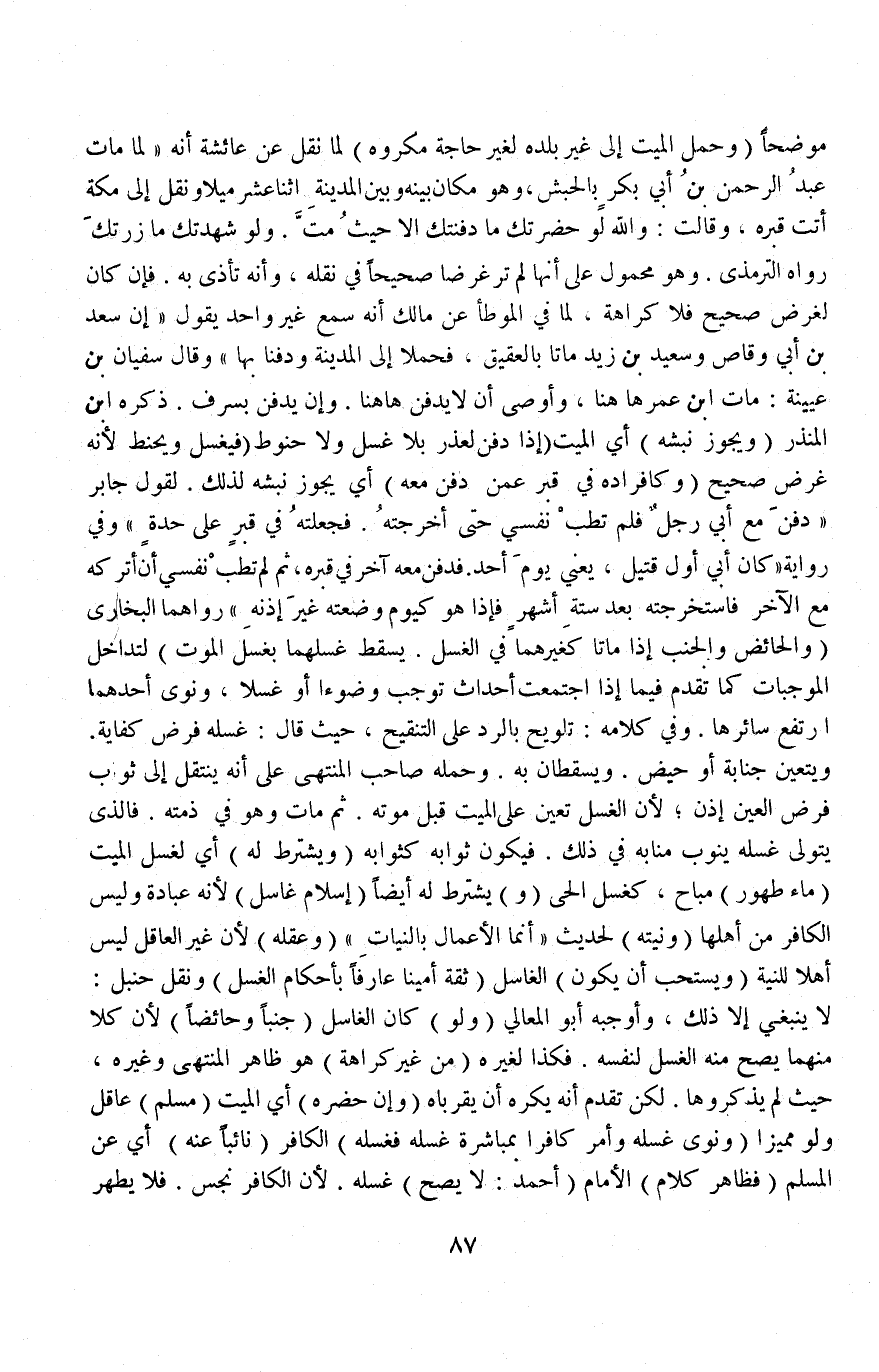 (وَحَمْلُ الْمَيِّتِ إلَى غَيْرِ بَلَدِهِ لِغَيْرِ حَاجَةٍ مَكْرُوهٌ) لِمَا نُقِلَ عَنْ عَائِشَةَ أَنَّهُ " لَمَّا مَاتَ عَبْدُ الرَّحْمَنِ بْنِ أَبِي بَكْرٍ بِالْحَبَشِ، وَهُوَ مَكَانٌ بَيْنَهُ وَبَيْنَ الْمَدِينَةِ اثْنَا عَشَرَ مِيلًا وَنُقِلَ إلَى مَكَّةَ أَتَتْ قَبْرَهُ وَقَالَتْ: وَاَللَّهِ لَوْ حَضَرْتُكَ مَا دَفَنْتُك إلَّا حَيْثُ مِتَّ وَلَوْ شَهِدْتُكَ مَا زُرْتُكَ رَوَاهُ التِّرْمِذِيَّ وَهُوَ مَحْمُولٌ عَلَى أَنَّهَا لَمْ تَرَ غَرَضًا صَحِيحًا فِي نَقْلِهِ، وَأَنَّهُ تَأَذَّى بِهِ فَإِنْ كَانَ لِغَرَضٍ صَحِيح فَلَا كَرَاهَةَ، لِمَا فِي الْمُوَطَّأِ عَنْ مَالِكٍ أَنَّهُ سَمِعَ غَيْرَ وَاحِدٍ يَقُولُ " إنَّ سَعْدَ بْنَ أَبِي وَقَّاصٍ وَسَعِيدَ بْنَ زَيْدٍ مَاتَا بِالْعَقِيقِ فَحُمِلَا إلَى الْمَدِينَةِ وَدُفِنَا بِهَا وَقَالَ سُفْيَانُ بْنُ عُيَيْنَةَ: مَاتَ ابْنُ عُمَرَ هَاهُنَا، وَأَوْصَى أَنْ لَا يُدْفَنَ هَاهُنَا وَأَنْ يُدْفَنَ بِسَرِفٍ ذَكَرَهُ ابْنُ الْمُنْذِرِ.