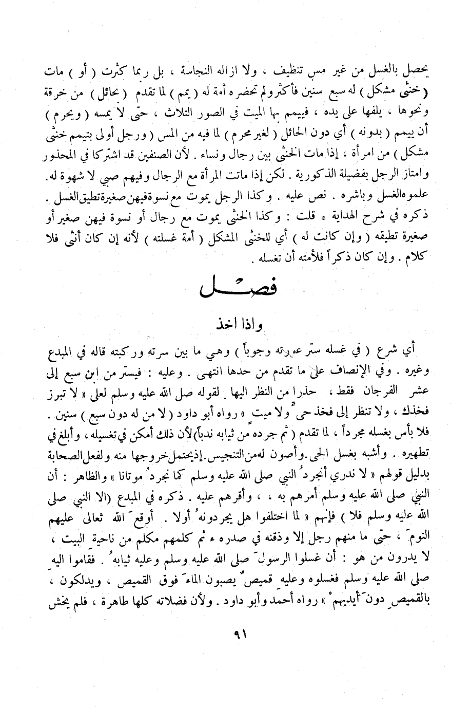 وَفِي الْإِنْصَافِ عَلَى مَا تَقَدَّمَ مِنْ حَدِّهَا انْتَهَى وَعَلَيْهِ: فَيُسْتَرُ مِنْ ابْنِ سَبْعٍ إلَى عَشْرٍ الْفَرْجَانِ فَقَطْ، حَذَرًا مِنْ النَّظَرِ إلَيْهَا لِقَوْلِهِ - صَلَّى اللَّهُ عَلَيْهِ وَسَلَّمَ - لِعَلِيٍّ «لَا تُبْرِزْ فَخِذَكَ، وَلَا تَنْظُر إلَى فَخِذِ حَيٍّ وَلَا مَيِّتٍ» رَوَاهُ أَبُو دَاوُد (لَا مَنْ) لَهُ (دُونَ سَبْعِ سِنِينَ) فَلَا بَأْسَ بِغُسْلِهِ مُجَرَّدًا، لِمَا تَقَدَّمَ (ثُمَّ جَرَّدَهُ مِنْ ثِيَابِهِ نَدْبًا) لِأَنَّ ذَلِكَ أَمْكَنُ فِي تَغْسِيلِهِ، وَأَبْلَغُ فِي تَطْهِيرِهِ وَأَشْبَهُ بِغُسْلِ الْحَيِّ وَأَصْوَنُ لَهُ مِنْ التَّنْجِيسِ إذْ يُحْتَمَل خُرُوجُهَا مِنْهُ وَلِفِعْلِ الصَّحَابَةِ بِدَلِيلِ قَوْلِهِمْ " لَا نَدْرِي أَنُجَرِّدُ النَّبِيَّ - صَلَّى اللَّهُ عَلَيْهِ وَسَلَّمَ - كَمَا نُجَرِّدُ مَوْتَانَا " وَالظَّاهِرُ: أَنَّ النَّبِيَّ - صَلَّى اللَّهُ عَلَيْهِ وَسَلَّمَ - أَمَرَهُمْ بِهِ، وَأَقَرَّهُمْ عَلَيْهِ ذَكَرَهُ فِي الْمُبْدِعِ (إلَّا النَّبِيَّ - صَلَّى اللَّهُ عَلَيْهِ وَسَلَّمَ - فَلَا) فَإِنَّهُمْ " لَمَّا اخْتَلَفُوا هَلْ يُجَرِّدُونَهُ أَوْ لَا أَوْقَعَ اللَّهُ تَعَالَى عَلَيْهِمْ النَّوْمَ، حَتَّى مَا مِنْهُمْ رَجُلٌ إلَّا وَذَقَنُهُ فِي صَدْرِهِ ثُمَّ كَلَّمَهُمْ مُكَلِّمٌ مِنْ نَاحِيَةِ الْبَيْتِ، لَا يَدْرُونَ مَنْ هُوَ: أَنْ غَسِّلُوا الرَّسُولَ - صَلَّى اللَّهُ عَلَيْهِ وَسَلَّمَ - وَعَلَيْهِ ثِيَابُهُ فَقَامُوا إلَيْهِ - صَلَّى اللَّهُ عَلَيْهِ وَسَلَّمَ - فَغَسَّلُوهُ وَعَلَيْهِ قَمِيصٌ يَصُبُّونَ الْمَاءَ فَوْقَ الْقَمِيصِ، وَيُدَلِّكُونَ، بِالْقَمِيصِ دُونَ أَيْدِيهِمْ رَوَاهُ أَحْمَدُ وَأَبُو دَاوُد وَلِأَنَّ فَضَلَاتِهِ كُلَّهَا طَاهِرَةٌ، فَلَمْ يُخْشَ