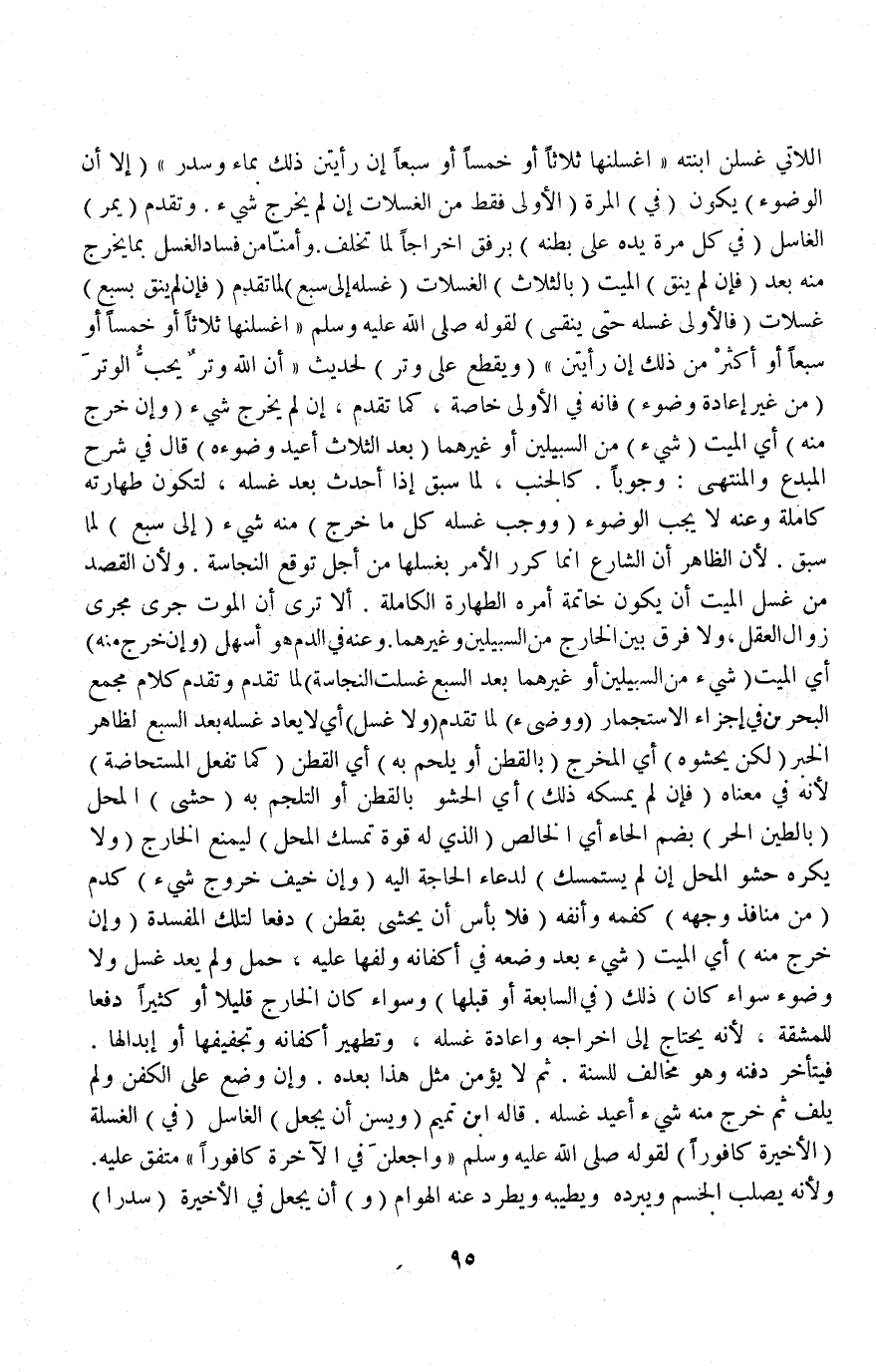 اللَّاتِي غَسَّلْنَ ابْنَتَهُ «اغْسِلْنَهَا ثَلَاثًا أَوْ خَمْسًا أَوْ سَبْعًا إنْ رَأَيْتُنَّ ذَلِكَ بِمَاءٍ وَسِدْرٍ» (إلَّا أَنَّ الْوُضُوءَ) يَكُونُ (فِي) الْمَرَّةِ (الْأُولَى فَقَطْ) مِنْ الْغَسَلَاتِ إنْ لَمْ يَخْرُجْ شَيْءٌ وَتَقَدَّمَ (يُمِرُّ) الْغَاسِلُ (فِي كُلِّ مَرَّةٍ يَدَهُ عَلَى بَطْنِهِ) بِرِفْقٍ إخْرَاجًا لِمَا تَخَلَّفَ وَأَمْنًا مِنْ فَسَادِ الْغُسْلِ بِمَا يَخْرُجُ مِنْهُ بَعْدُ (فَإِنْ لَمْ يُنَقَّ) الْمَيِّتُ (بِالثَّلَاثِ) الْغَسَلَاتِ (غَسَّلَهُ إلَى سَبْعٍ) لِمَا تَقَدَّمَ (فَإِنْ لَمْ يُنَقَّ بِسَبْعِ) غَسَلَاتٍ (فَالْأَوْلَى غُسْلُهُ حَتَّى يُنَقَّى) لِقَوْلِهِ - صَلَّى اللَّهُ عَلَيْهِ وَسَلَّمَ - " اغْسِلْنَهَا ثَلَاثًا أَوْ خَمْسًا أَوْ سَبْعًا أَوْ أَكْثَرَ مِنْ ذَلِكَ إنْ رَأَيْتُنَّ ".