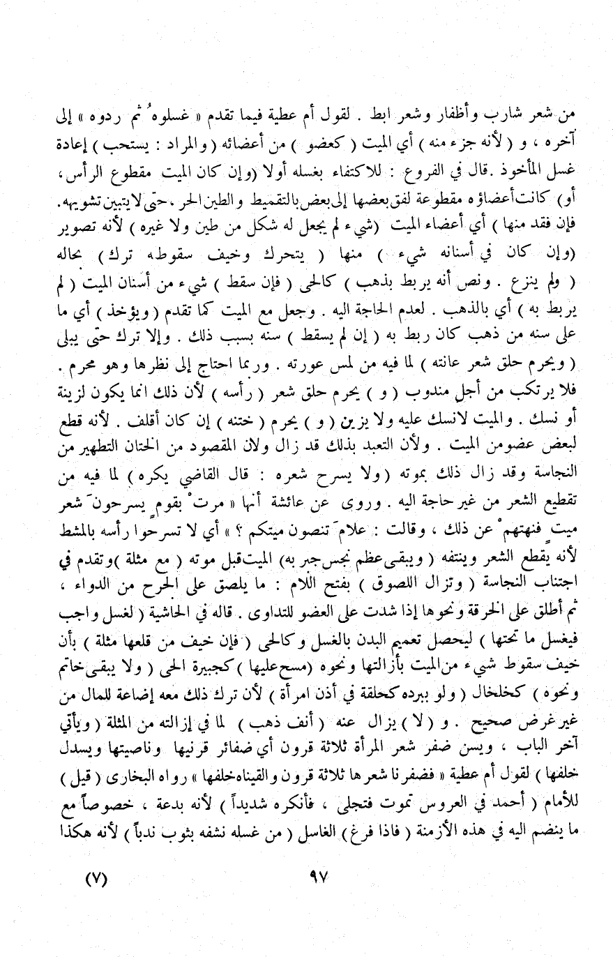 وَرُبَّمَا احْتَاجَ إلَى نَظَرِهَا وَهُوَ مُحَرَّمٌ فَلَا يُرْتَكَبُ مِنْ أَجَلِ مَنْدُوبٍ وَيَحْرُمُ حَلْقُ شَعْرِ (رَأْسِهِ) لِأَنَّ ذَلِكَ إنَّمَا يَكُونُ لِزِينَةٍ أَوْ نُسُكٍ وَالْمَيِّتُ لَا نُسُكَ عَلَيْهِ وَلَا يُزَيَّنُ.