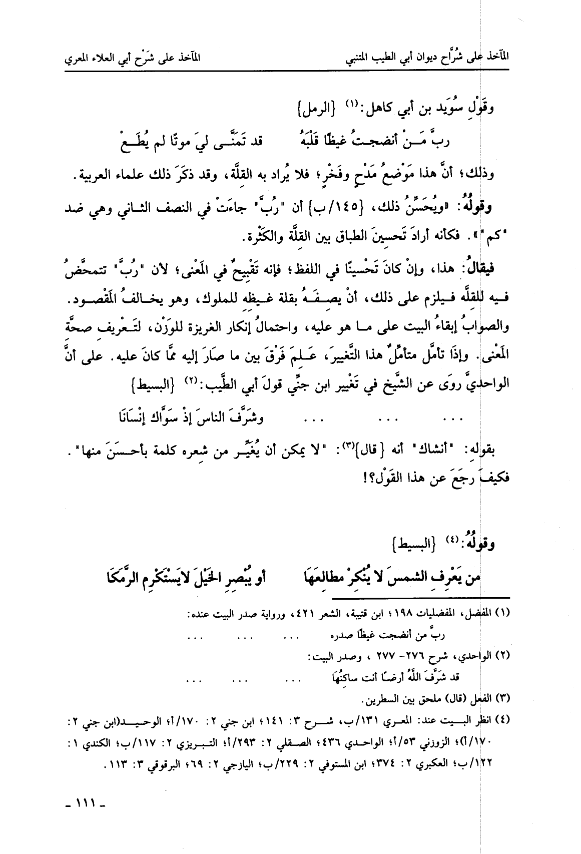 فيقال: هذا، وان كان تحسينا في اللفظ، فأنه تقبيح في المعنى، لأن ربّ تتمخّض فيه للقلّة فيلزم على ذلك، أن يصفه بقلة غيظه للملوك، وهو يخالف المقصود. والصواب إبقاء البيت على ما هو عليه، واحتمال إنكار الغريزة للوزن، لتعريف صحّة المعنى. وإذا تأمّل هذا التّغيير، علم فوق بين ما صار إليه ممّا كان عليه. على أن الواحديّ روى عن الشّيخ في تغيير ابن جنّي قول أبي الطّيب: (البسيط)