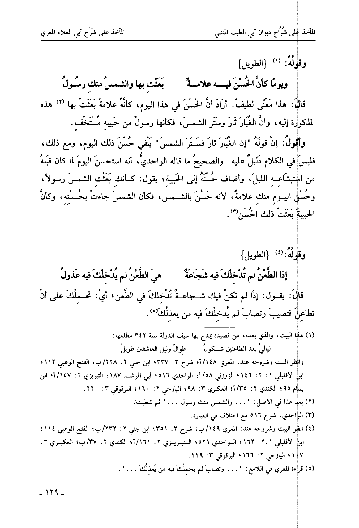 وأقول: أن قوله أن الغبار ثار فستر الشمس ينفي حسن ذلك اليوم، ومع ذلك، فليس في الكلام دليل عليه. والصحيح ما قاله الواحديّ، إنه استحسن اليوم لما كان قبله من استشباعه الليل، وأضاف حسنة إلى الحبيبة، يقول: كأنك بعثت الشمس رسولا، وحسن اليوم منك علامة، لأنه حسن بالشمس، فكأن الشمس جاءت بحسنه، وكأنّ الحبيبة بعثت ذلك الحسن.