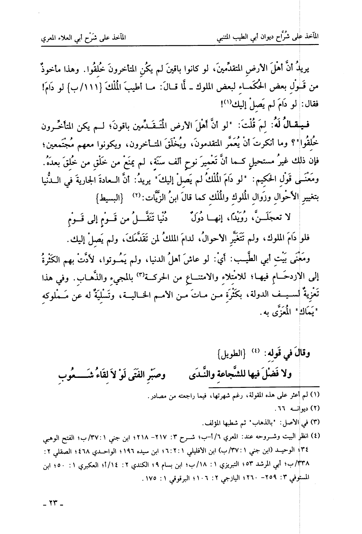فيقال له: لم قلت: لو أن أهل الأرض المتقدّمين باقون، لم يكن المتأخرون خلقوا؟ وما أنكرت أن يعمّر المتقدمون، ويخلق المتأخرون، ويكونوا معهم مجتمعين، فإن ذلك غير مستحيل كما أن تعمير نوح ألف سنة، لم يمنع من خلق من خلق بعده. ومعنى قول الحكيم: لو دام الملك لم يصل إليك يريد: أن العادة الجارية في الدّنيا بتغيير الأحوال وزوال الملوك والملك كما قال ابن الزّيّات: (البسيط)