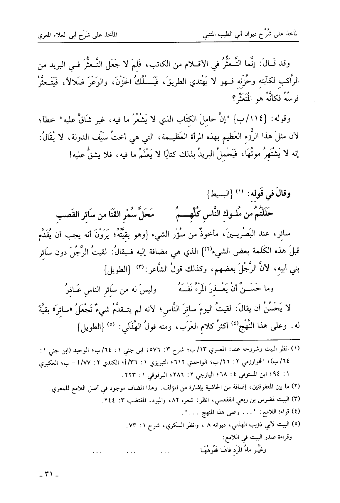 وقد قال: إنما التّعثّر في الأقلام من الكاتب، فلم لا جعل التعثّر في البريد من الرّاكب لكآبته وحزنه فهو لا يهتدي الطريق، فيسلك الحزن، والوعر ضلالا، فيتعثّر فرسه فكأنّه هو المتعثّر؟