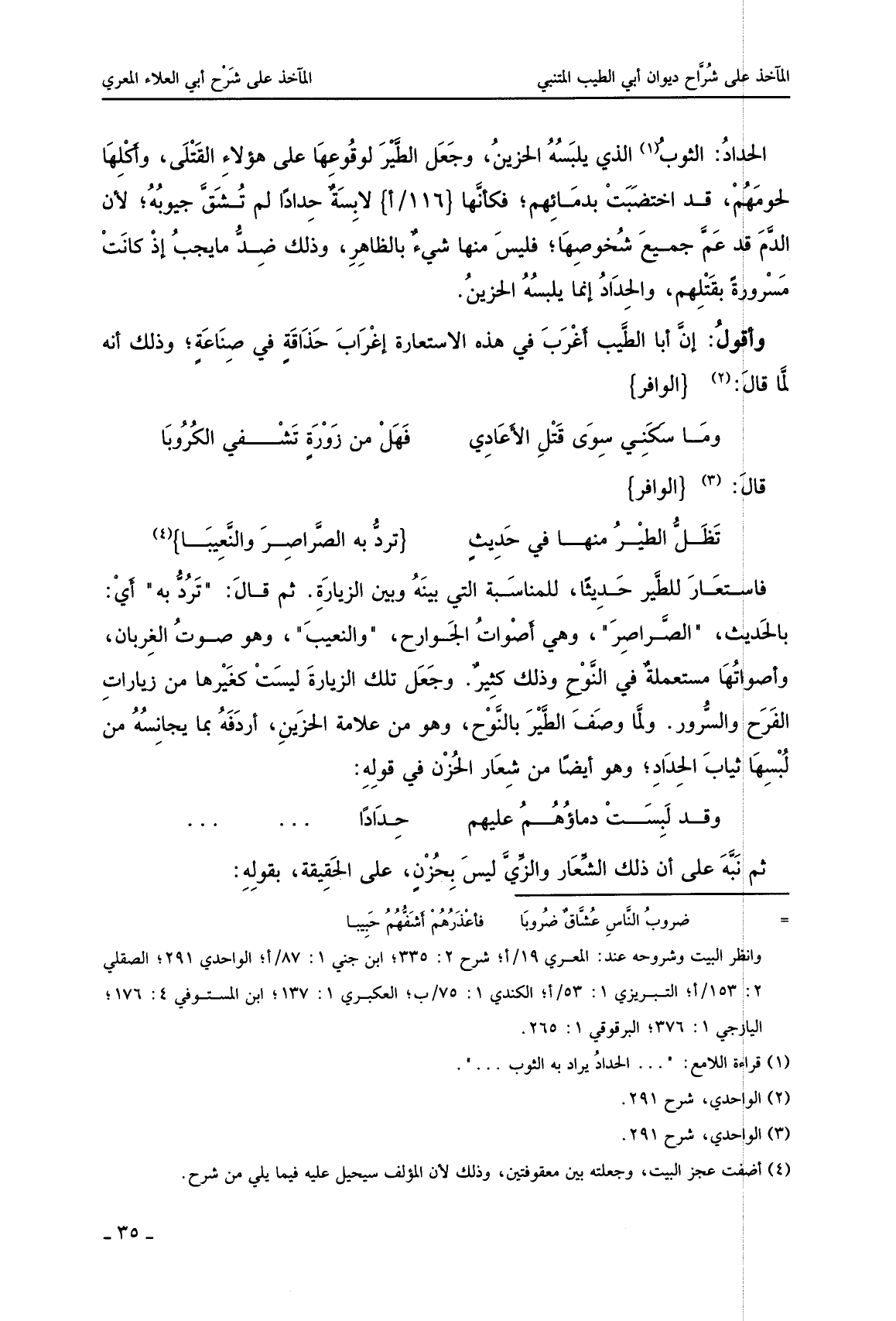 فاستعار للطّير حديثا، للمناسبة التي بينه وبين الزيارة. ثم قال: تردّ به أي: بالحديث، الصّراصر، وهي أصوات الجوارح، والنعيب، وهو صوت الغربان، وأصواتها مستعملة في النّوح وذلك كثير. وجعل تلك الزيارة ليست كغيرها من زيارات الفرح والسّرور. ولمّا وصف الطّير بالنّوح، وهو من علامة الحزين، أردفه بما يجانسه من لبسها ثياب الحداد، وهو أيضاً من شعار الحزن في قوله: