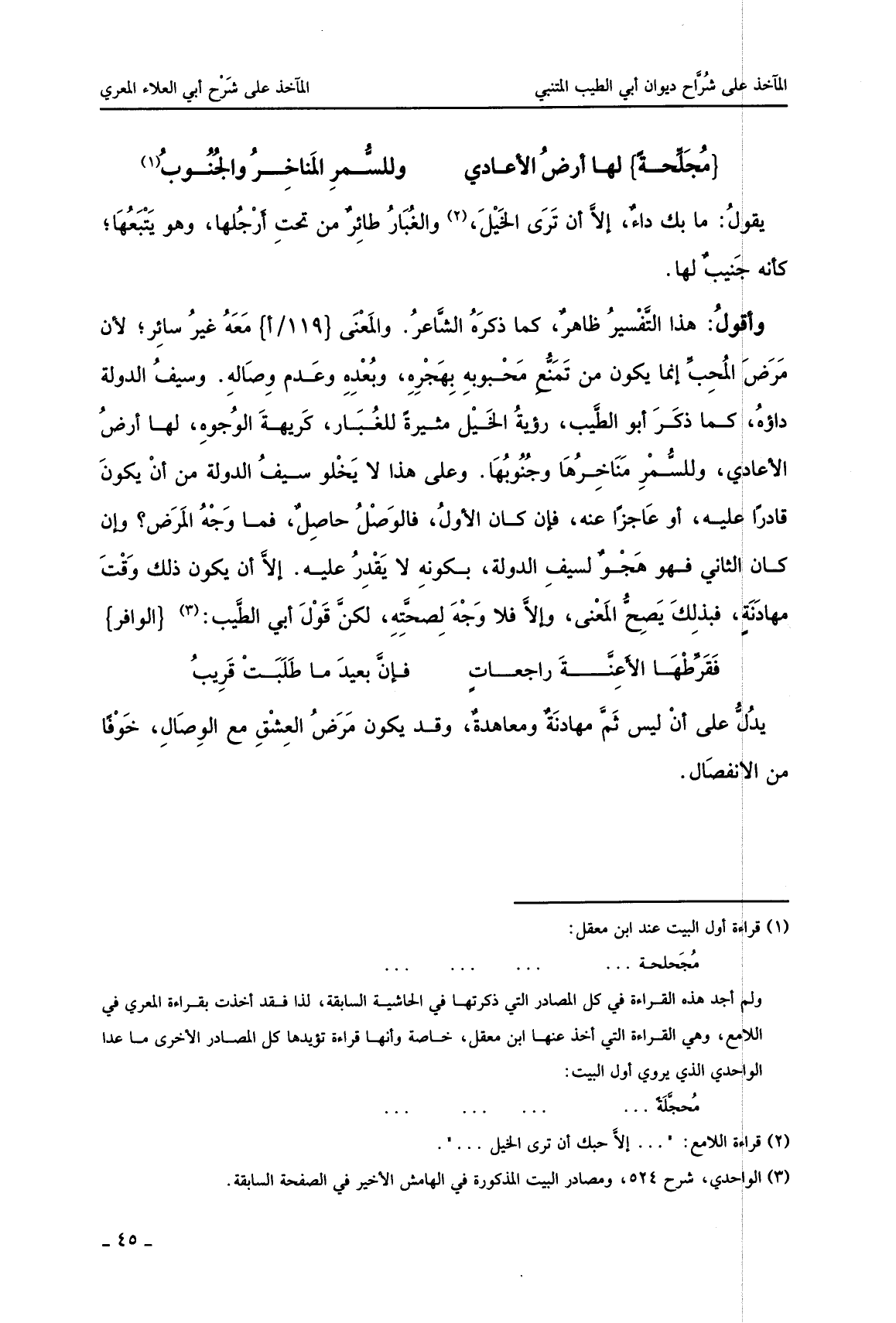 وأقول: هذا التّفسير ظاهر، كما ذكره الشّاعر. والمعنى معه غير سائر ولأن مرض المحبّ إنما يكون من تمنّع حبوبه بهجره، وبعده وعدم وصاله. وسيف الدولة داؤه، كما ذكر أبو الطّيب، رؤية الخيل مثيرة للغبار، كريهة الوجوه، لها أرض الأعادي، وللسّمر مناخرها وجنوبها. وعلى هذا لا يخلو سيف الدولة من أن يكون قادرا عليه، أو عاجز عنه، فإن كان الأول، فالوصل حاصل، فما وجه المرض؟ وإن كان الثاني فهو هجو لسيف الدولة، بكونه لا يقدر عليه. إلا أن يكون ذلك وقت مهادنة، فبذلك يصحّ المعنى، وإلا فلا وجه لصحّته، لكنّ قول أبي الطّيب: (الوافر)