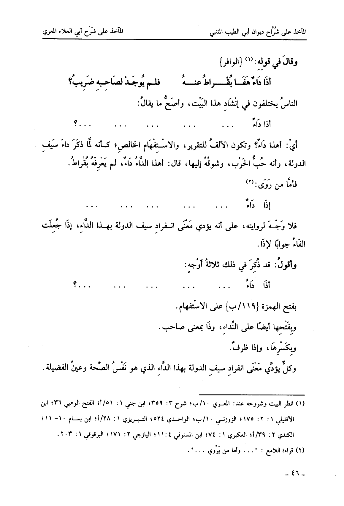 فلا وجه لروايته، على إنه يؤدي معنى انفراد سيف الدولة بهذا الدّاء، إذا جعلت الفاء جوابا لاذا.