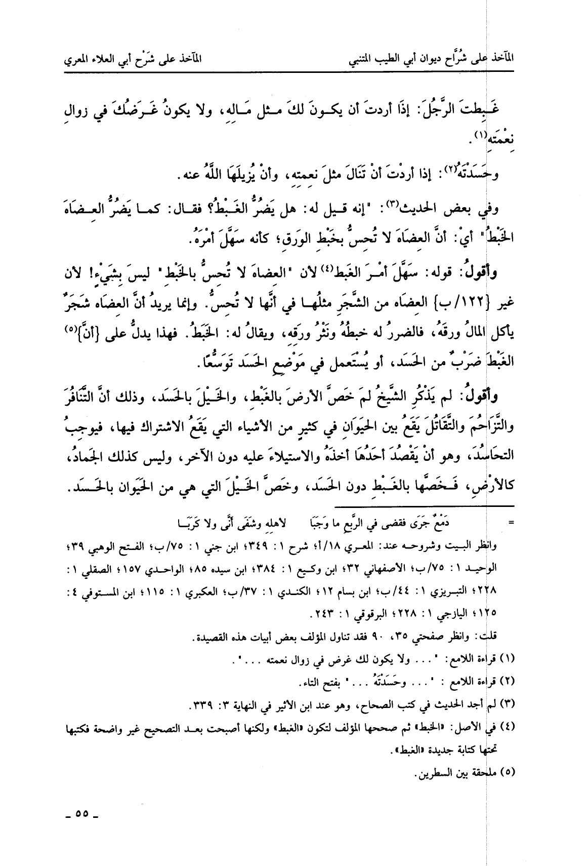 وأقول: قوله: سهّل أمر الغبط لأن العضاه لا تحسّ بالخبط ليس بشيء! لأن غير العضاه من الشّجر مثلها في إنها لا تحسّ. وإنما يريد أن العضاه شجر يأكل المال ورقه، فالضرر له خبطه ونثر ورقه، ويقال له: الخبط. فهذا يدلّ على (أنّ) الغبط ضرب من الحسد، أو يستعمل في موضع الحسد توسّعا.