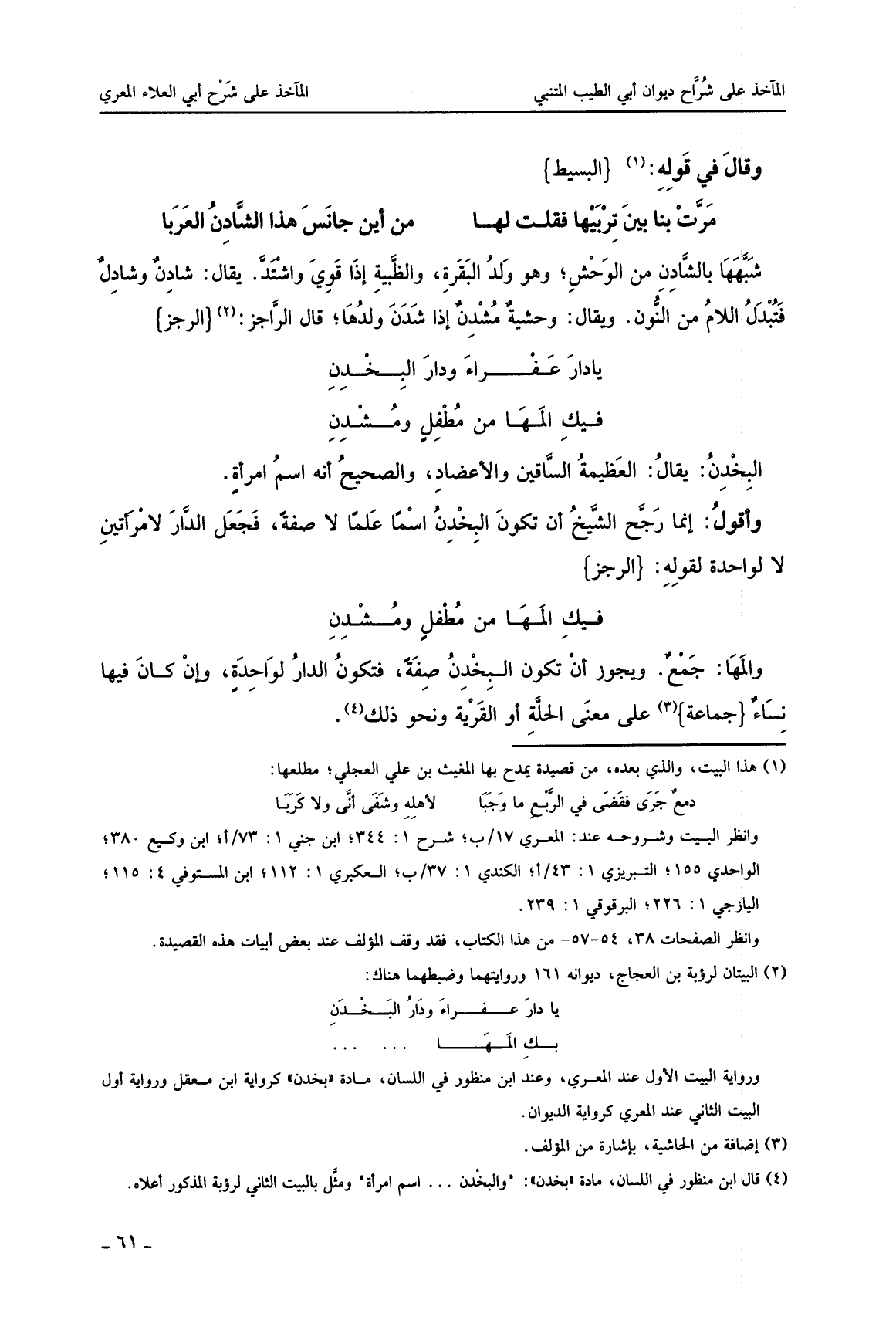 وأقول: إنما رجّح الشّيخ أن تكون البخدن اسما علما لا صفة، فجعل الدّار لامرأتين لا لواحدة لقوله: (الرجز)