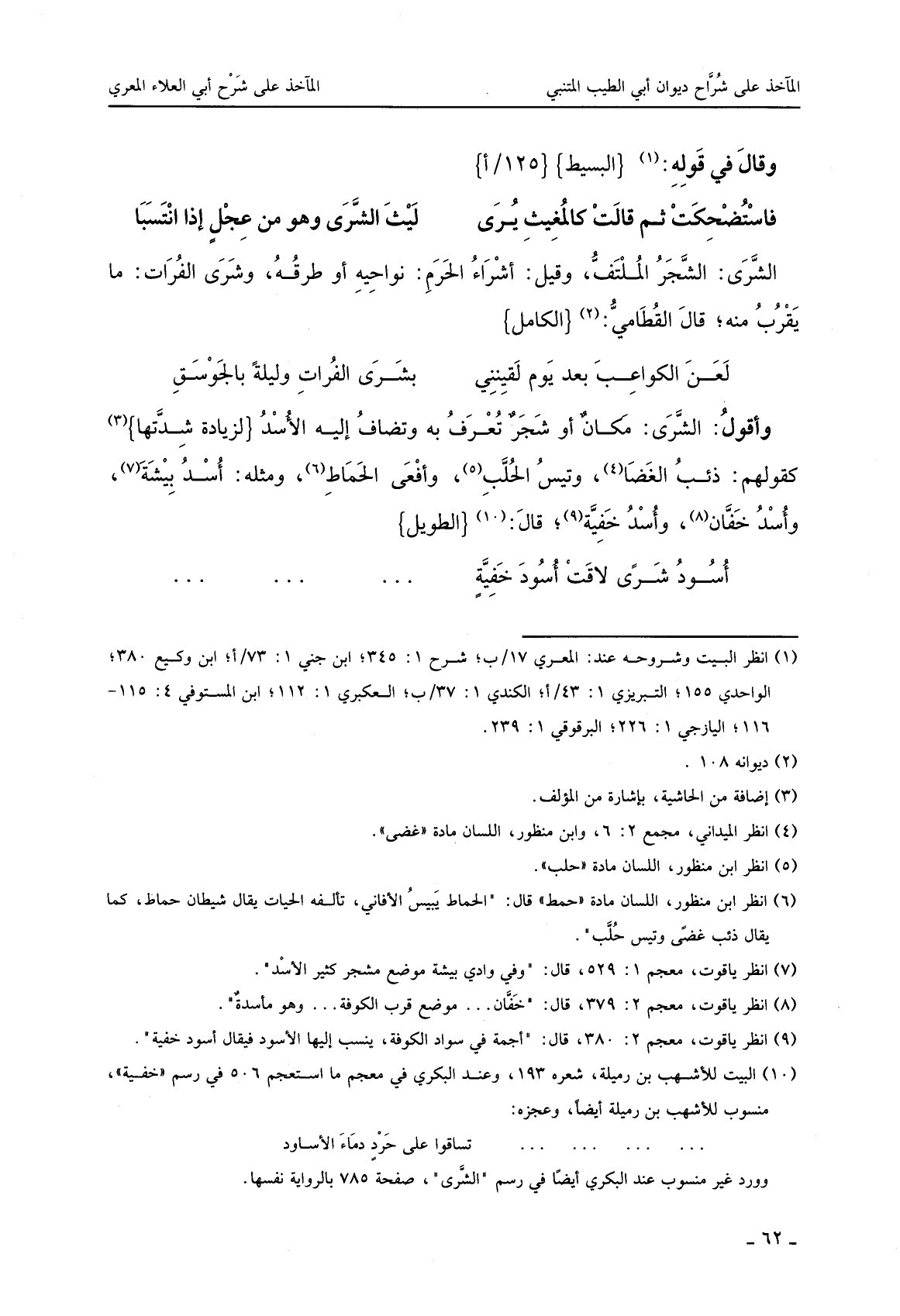 وأقول: الشّرى: مكان أو شجر تعرف به وتضاف إليه الأسد (لزيادة شدّتها) كقولهم: ذئب الغضا، وتيس الحلّب، وأفعى الحماط، ومثله: أسد بيشة، وأسد خفّان، وأسد خفيّة، قال: (الطويل)