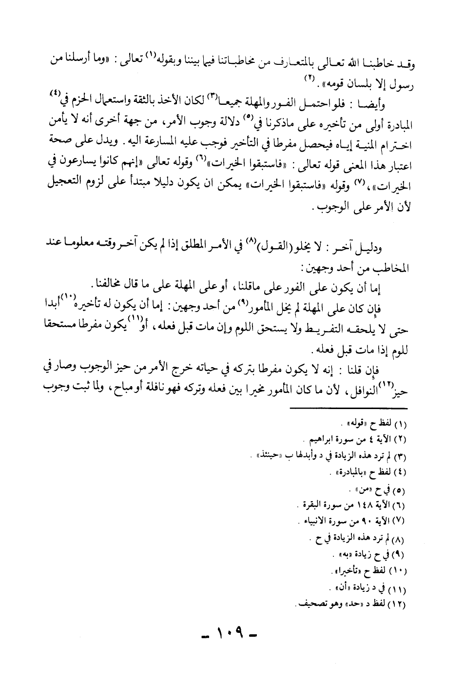 وَقَدْ خَاطَبَنَا اللَّهُ تَعَالَى بِالْمُتَعَارَفِ مِنْ مُخَاطَبَاتِنَا فِيمَا بَيْنَنَا وَبِقَوْلِهِ تَعَالَى: {وَمَا أَرْسَلْنَا مِنْ رَسُولٍ إلَّا بِلِسَانِ قَوْمِهِ} [إبراهيم: 4] . وَأَيْضًا: فَلَوْ احْتَمَلَ الْفَوْرَ وَالْمُهْلَةَ جَمِيعًا لَكَانَ الْأَخْذُ بِالثِّقَةِ وَاسْتِعْمَالُ الْحَزْمِ فِي الْمُبَادَرَةِ أَوْلَى مِنْ تَأْخِيرِهِ عَلَى مَا ذَكَرْنَا فِي دَلَالَةِ وُجُوبِ الْأَمْرِ، مِنْ جِهَةٍ أُخْرَى أَنَّهُ لَا يَأْمَنُ اخْتِرَامَ الْمَنِيَّةِ إيَّاهُ فَيَحْصُلُ مُفْرِطًا فِي التَّأْخِيرِ فَوَجَبَ عَلَيْهِ الْمُسَارَعَةُ إلَيْهِ. وَيَدُلُّ عَلَى صِحَّةِ اعْتِبَارِ هَذَا الْمَعْنَى قَوْله تَعَالَى: {فَاسْتَبِقُوا الْخَيْرَاتِ} [البقرة: 148] وقَوْله تَعَالَى {إنَّهُمْ كَانُوا يُسَارِعُونَ فِي الْخَيْرَاتِ} [الأنبياء: 90] ، وَقَوْلُهُ {فَاسْتَبِقُوا الْخَيْرَاتِ} [البقرة: 148] يُمْكِنُ أَنْ يَكُونَ دَلِيلًا مُبْتَدَأً عَلَى لُزُومِ التَّعْجِيلِ لِأَنَّ الْأَمْرَ عَلَى الْوُجُوبِ.