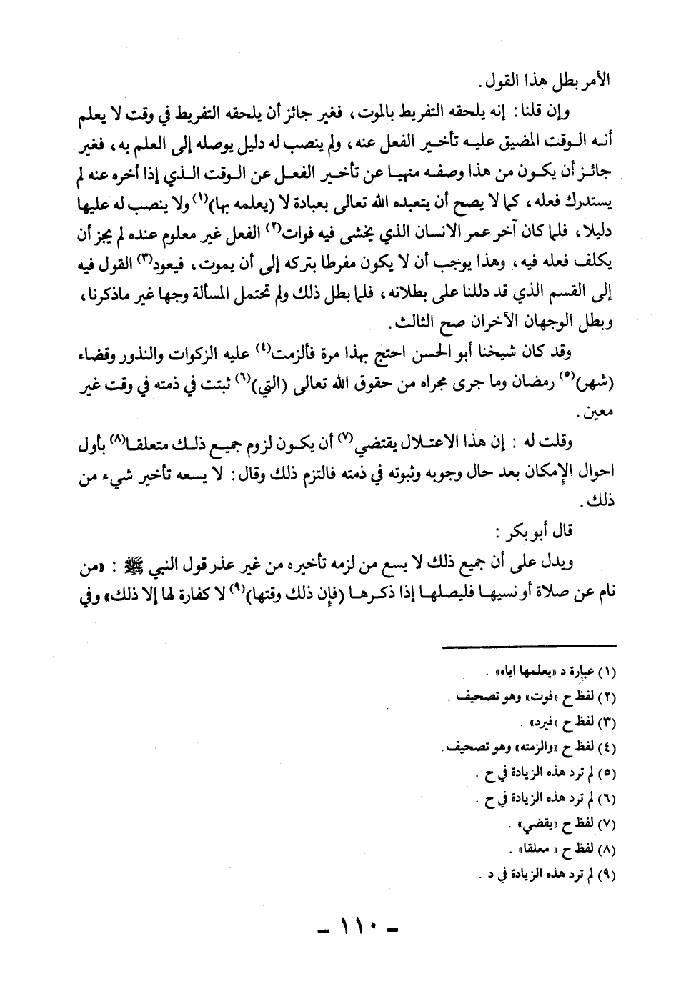 قَالَ أَبُو بَكْرٍ: وَيَدُلُّ عَلَى أَنَّ جَمِيعَ ذَلِكَ لَا يَسَعُ مَنْ لَزِمَهُ تَأْخِيرُهُ مِنْ غَيْرِ عُذْرٍ قَوْلُ النَّبِيِّ - صَلَّى اللَّهُ عَلَيْهِ وَسَلَّمَ -: «مَنْ نَامَ عَنْ صَلَاةٍ أَوْ نَسِيَهَا فَلْيُصَلِّهَا إذَا ذَكَرَهَا فَإِنَّ ذَلِكَ وَقْتُهَا لَا كَفَّارَةَ لَهَا إلَّا ذَلِكَ» وَفِي