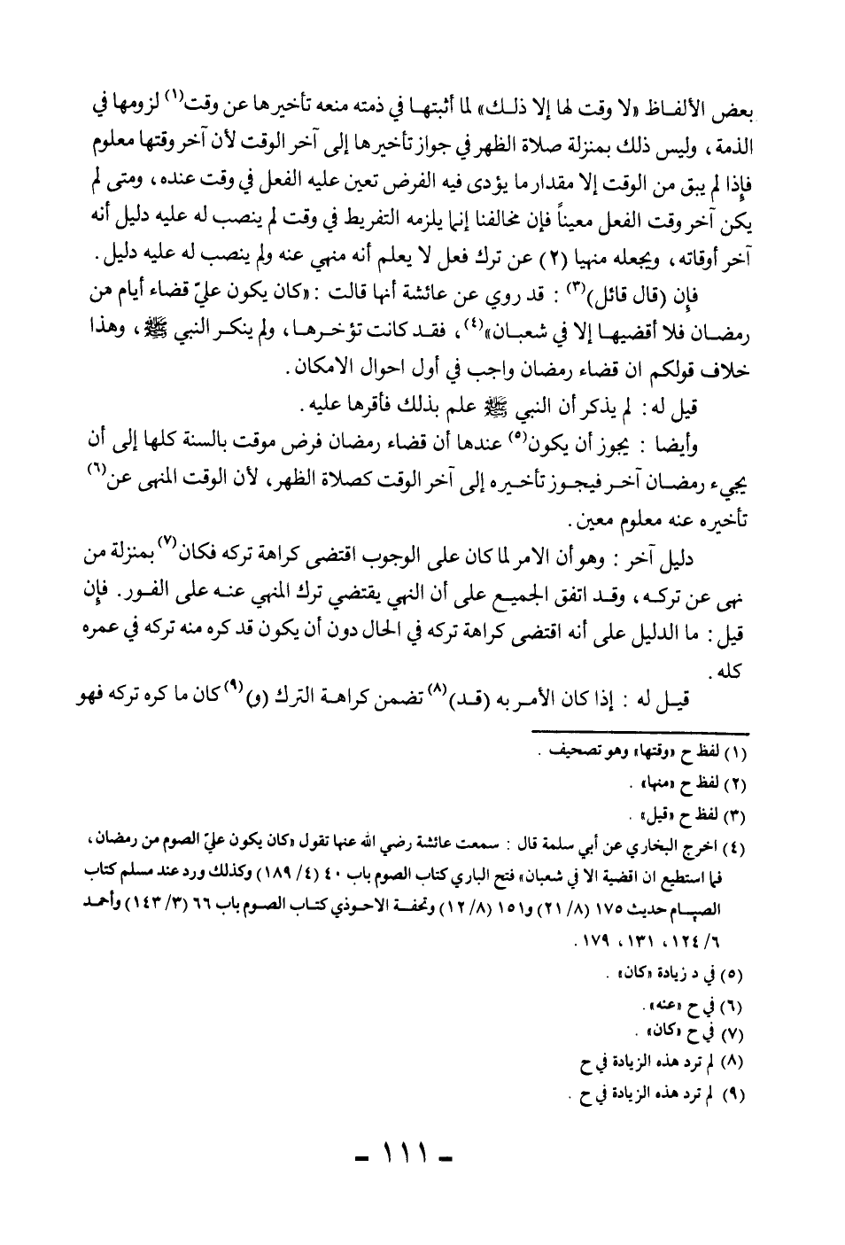 بَعْضِ الْأَلْفَاظِ " لَا وَقْتَ لَهَا إلَّا ذَلِكَ " لَمَّا أَثْبَتَهَا فِي ذِمَّتِهِ مَنَعَهُ تَأْخِيرُهَا عَنْ وَقْتِ لُزُومِهَا فِي الذِّمَّةِ، وَلَيْسَ ذَلِكَ بِمَنْزِلَةِ صَلَاةِ الظُّهْرِ فِي جَوَازِ تَأْخِيرِهَا إلَى آخِرِ الْوَقْتِ لِأَنَّ آخِرَ وَقْتِهَا مَعْلُومٌ فَإِذَا لَمْ يَبْقَ مِنْ الْوَقْتِ إلَّا مِقْدَارُ مَا يُؤَدَّى فِيهِ الْفَرْضُ تَعَيَّنَ عَلَيْهِ الْفِعْلُ فِي وَقْتٍ عِنْدَهُ، وَمَتَى لَمْ يَكُنْ آخِرُ وَقْتِ الْفِعْلِ مُعَيَّنًا فَإِنَّ مُخَالِفَنَا إنَّمَا يَلْزَمُهُ التَّفْرِيطُ فِي وَقْتٍ لَمْ يُنْصَبْ لَهُ عَلَيْهِ دَلِيلٌ أَنَّهُ آخِرُ أَوْقَاتِهِ، وَيَجْعَلُهُ مَنْهِيًّا عَنْ تَرْكِ فِعْلٍ لَا يَعْلَمُ أَنَّهُ مَنْهِيٌّ عَنْهُ وَلَمْ يُنْصَبْ لَهُ عَلَيْهِ دَلِيلٌ.