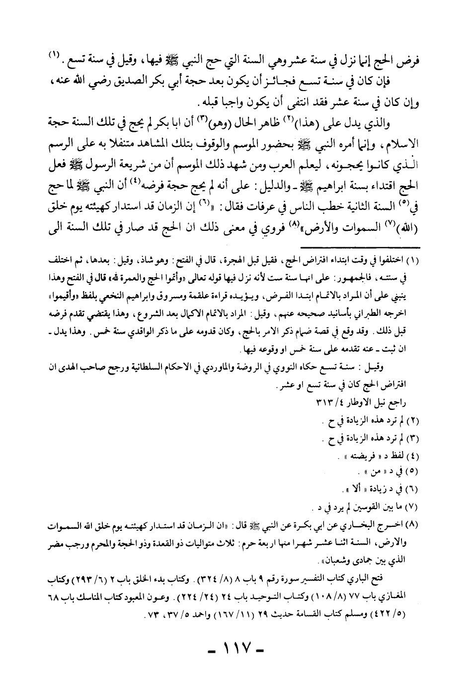 وَاَلَّذِي يَدُلُّ عَلَى (هَذَا) ظَاهِرُ الْحَالِ (وَهُوَ) أَنَّ أَبَا بَكْرٍ لَمْ يَحُجَّ فِي تِلْكَ السَّنَةِ حَجَّةَ الْإِسْلَامِ، وَإِنَّمَا أَمَرَهُ النَّبِيُّ - صَلَّى اللَّهُ عَلَيْهِ وَسَلَّمَ - بِحُضُورِ الْمَوْسِمِ وَالْوُقُوفِ بِتِلْكَ الْمَشَاهِدِ مُتَنَفِّلًا بِهِ عَلَى الرَّسْمِ الَّذِي كَانُوا يَحُجُّونَهُ، لِيَعْلَمَ الْعَرَبُ وَمَنْ شَهِدَ ذَلِكَ الْمَوْسِمَ أَنَّ مِنْ شَرِيعَةِ الرَّسُولِ - صَلَّى اللَّهُ عَلَيْهِ وَسَلَّمَ - فِعْلَ الْحَجِّ اقْتِدَاءً بِسُنَّةِ إبْرَاهِيمَ - صَلَّى اللَّهُ عَلَيْهِ وَسَلَّمَ - وَالدَّلِيلُ: عَلَى أَنَّهُ لَمْ يَحُجَّ حَجَّةَ فَرْضِهِ «أَنَّ النَّبِيَّ - صَلَّى اللَّهُ عَلَيْهِ وَسَلَّمَ - لَمَّا حَجَّ فِي السَّنَةِ الثَّانِيَةِ خَطَبَ النَّاسَ فِي عَرَفَاتٍ فَقَالَ: إنَّ الزَّمَانَ قَدْ اسْتَدَارَ كَهَيْئَتِهِ يَوْمَ خَلَقَ اللَّهُ السَّمَوَاتِ وَالْأَرْضَ» فَرُوِيَ فِي مَعْنَى ذَلِكَ أَنَّ الْحَجَّ قَدْ صَارَ فِي تِلْكَ السَّنَةِ إلَى
