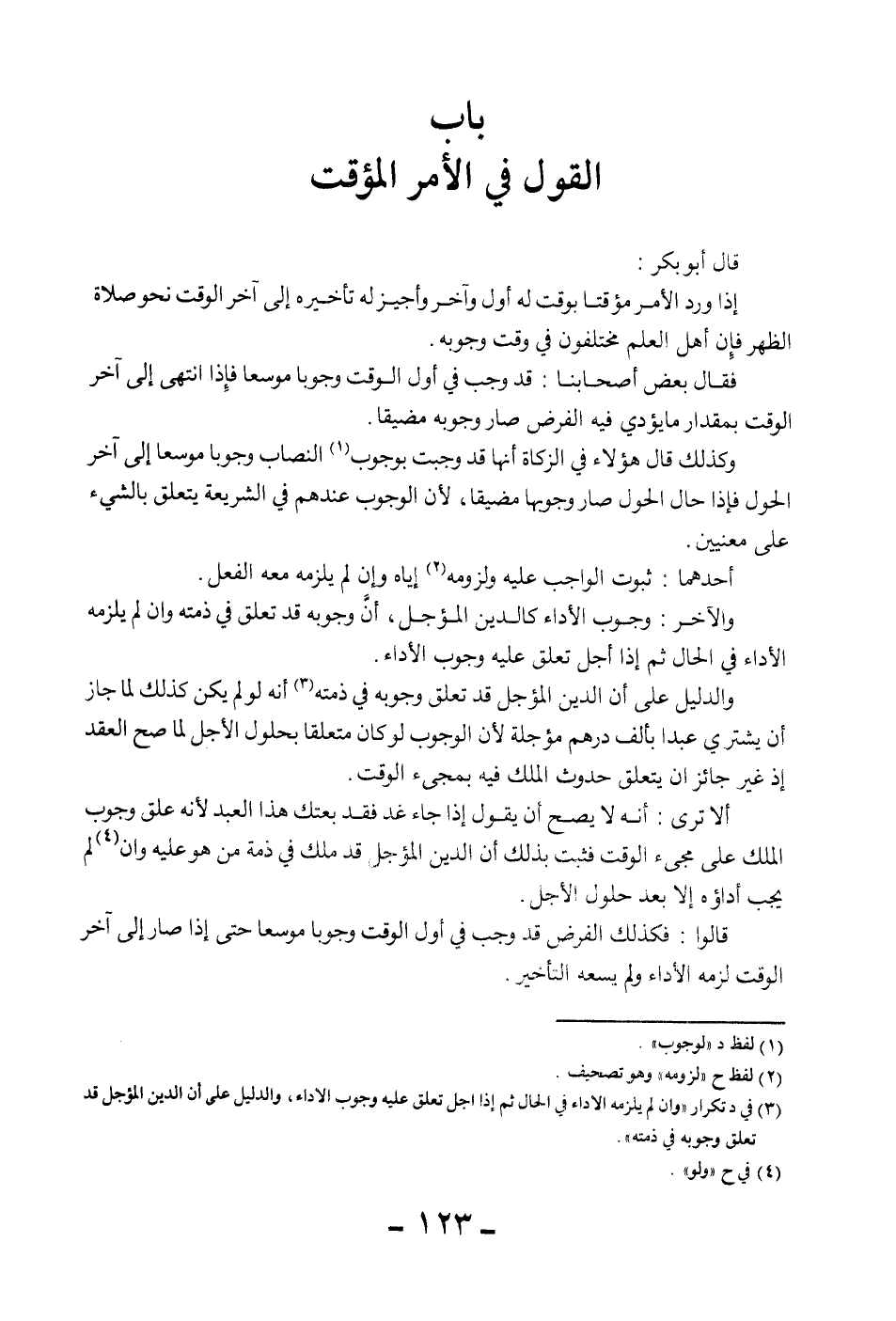 بَابُ الْقَوْلِ فِي الْأَمْرِ الْمُؤَقَّتِ قَالَ أَبُو بَكْرٍ: إذَا وَرَدَ الْأَمْرُ مُؤَقَّتًا بِوَقْتٍ لَهُ أَوَّلٌ وَآخِرٌ وَأُجِيزَ لَهُ تَأْخِيرُهُ إلَى آخِرِ الْوَقْتِ نَحْوُ صَلَاةِ الظُّهْرِ فَإِنَّ أَهْلَ الْعِلْمِ مُخْتَلِفُونَ فِي وَقْتِ وُجُوبِهِ. فَقَالَ بَعْضُ أَصْحَابِنَا: قَدْ وَجَبَ فِي أَوَّلِ الْوَقْتِ وُجُوبًا مُوَسَّعًا فَإِذَا انْتَهَى إلَى آخِرِ الْوَقْتِ بِمِقْدَارِ مَا يُؤَدِّي فِيهِ الْفَرْضَ صَارَ وُجُوبُهُ مُضَيَّقًا. وَكَذَلِكَ قَالَ هَؤُلَاءِ فِي الزَّكَاةِ أَنَّهَا قَدْ وَجَبَتْ بِوُجُوبِ النِّصَابِ وُجُوبًا مُوَسَّعًا إلَى آخِرِ الْحَوْلِ فَإِذَا حَالَ الْحَوْلُ صَارَ وُجُوبُهَا مُضَيَّقًا، لِأَنَّ الْوُجُوبَ عِنْدَهُمْ فِي الشَّرِيعَةِ يَتَعَلَّقُ بِالشَّيْءِ عَلَى مَعْنَيَيْنِ. أَحَدُهُمَا: ثُبُوتُ الْوَاجِبِ عَلَيْهِ وَلُزُومُهُ إيَّاهُ وَإِنْ لَمْ يَلْزَمْهُ مَعَهُ الْفِعْلُ. وَالْآخَرُ: وُجُوبُ الْأَدَاءِ كَالدَّيْنِ الْمُؤَجَّلِ، أَنَّ وُجُوبَهُ قَدْ تَعَلَّقَ فِي ذِمَّتِهِ وَإِنْ لَمْ يَلْزَمْهُ الْأَدَاءُ فِي الْحَالِ ثُمَّ إذَا أَجَّلَ تَعَلَّقَ عَلَيْهِ وُجُوبُ الْأَدَاءِ. وَالدَّلِيلُ عَلَى أَنَّ الدَّيْنَ الْمُؤَجَّلَ قَدْ تَعَلَّقَ وُجُوبُهُ فِي ذِمَّتِهِ أَنَّهُ لَوْ لَمْ يَكُنْ كَذَلِكَ لَمَا جَازَ أَنْ يَشْتَرِيَ عَبْدًا بِأَلْفِ دِرْهَمٍ مُؤَجَّلَةٍ لِأَنَّ الْوُجُوبَ لَوْ كَانَ مُتَعَلِّقًا بِحُلُولِ الْأَجَلِ لَمَا صَحَّ الْعَقْدُ إذْ غَيْرُ جَائِزٍ أَنْ يَتَعَلَّقَ حُدُوثُ الْمِلْكِ فِيهِ بِمَجِيءِ الْوَقْتِ.