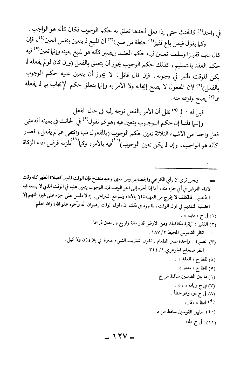 فِي وَاحِدٍ كَالْحِنْثِ حَتَّى إذَا فَعَلَ أَحَدَهَا تَعَلَّقَ بِهِ حُكْمُ الْوُجُوبِ فَكَانَ كَأَنَّهُ هُوَ الْوَاجِبُ. وَكَمَا يَقُولُ فِيمَنْ بَاعَ قَفِيزَ حِنْطَةٍ مِنْ صُبْرَةٍ إنَّ الْمَبِيعَ لَمْ يَتَعَيَّنْ بِنَفْسِ الْعَيْنِ، فَإِنْ كَالَ مِنْهَا قَفِيزًا وَسَلَّمَهُ تَعَيَّنَ فِيهِ حُكْمُ الْعَقْدِ وَيَصِيرُ كَأَنَّهُ هُوَ الْمَبِيعُ بِعَيْنِهِ وَإِنَّمَا تَعَيَّنَ فِيهِ حُكْمُ الْعَقْدِ بِالتَّسْلِيمِ، كَذَلِكَ حُكْمُ الْوُجُوبِ يَجُوزُ أَنْ يَتَعَلَّقَ بِالْفِعْلِ (وَإِنْ كَانَ لَوْ لَمْ يَفْعَلْهُ لَمْ يَكُنْ لِلْوَقْتِ تَأْثِيرٌ فِي وُجُوبِهِ. فَإِنْ قَالَ قَائِلٌ: لَا يَجُوزُ أَنْ يَتَعَيَّنَ عَلَيْهِ حُكْمُ الْوُجُوبِ بِالْفِعْلِ) لِأَنَّ الْمَفْعُولَ لَا يَصِحُّ إيجَابُهُ وَلَا الْأَمْرُ بِهِ وَإِنَّمَا يَتَعَلَّقُ حُكْمُ الْإِيجَابِ بِمَا لَمْ يَفْعَلْهُ مِمَّا يَصِحُّ وُقُوعُهُ مِنْهُ. قِيلَ لَهُ: لَمْ نَقُلْ إنَّ الْأَمْرَ بِالْفِعْلِ تَوَجَّهَ إلَيْهِ فِي حَالِ الْفِعْلِ.