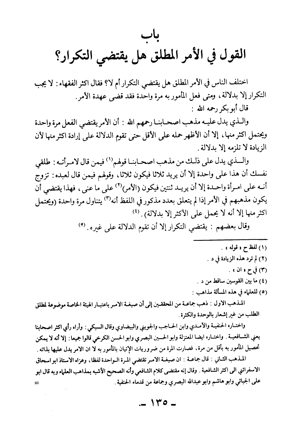 بَابُ الْقَوْلِ فِي الْأَمْرِ الْمُطْلَقِ هَلْ يَقْتَضِي التَّكْرَارَ؟ اخْتَلَفَ النَّاسُ فِي الْأَمْرِ الْمُطْلَقِ هَلْ يَقْتَضِي التَّكْرَارَ أَمْ لَا؟ فَقَالَ أَكْثَرُ الْفُقَهَاءِ: لَا يَجِبُ التَّكْرَارُ إلَّا بِدَلَالَةٍ، وَمَتَى فَعَلَ الْمَأْمُورُ بِهِ مَرَّةً وَاحِدَةً فَقَدْ قَضَى عُهْدَةَ الْأَمْرِ. قَالَ أَبُو بَكْرٍ - رَحِمَهُ اللَّهُ -: وَاَلَّذِي يَدُلُّ عَلَيْهِ مَذْهَبُ أَصْحَابِنَا - رَحِمَهُمُ اللَّهُ -: أَنَّ الْأَمْرَ يَقْتَضِي الْفِعْلَ مَرَّةً وَاحِدَةً وَيَحْتَمِلُ أَكْثَرَ مِنْهَا، إلَّا أَنَّ الْأَظْهَرَ حَمْلُهُ عَلَى الْأَقَلِّ حَتَّى تَقُومَ الدَّلَالَةُ عَلَى إرَادَةِ أَكْثَرَ مِنْهَا لِأَنَّ الزِّيَادَةَ لَا تَلْزَمُهُ إلَّا بِدَلَالَةٍ. وَاَلَّذِي يَدُلُّ عَلَى ذَلِكَ مِنْ مَذْهَبِ أَصْحَابِنَا قَوْلُهُمْ فِيمَنْ قَالَ لِامْرَأَتِهِ: طَلِّقِي نَفْسَك أَنَّ هَذَا عَلَى وَاحِدَةٍ إلَّا أَنْ يُرِيدَ ثَلَاثًا فَيَكُونُ ثَلَاثًا، وَقَوْلُهُمْ فِيمَنْ قَالَ لِعَبْدِهِ: تَزَوَّجْ أَنَّهُ عَلَى امْرَأَةٍ وَاحِدَةٍ إلَّا أَنْ يُرِيدَ ثِنْتَيْنِ فَيَكُونُ (الْأَمْرُ) عَلَى مَا عَنَى، فَهَذَا يَقْتَضِي أَنْ يَكُونَ مَذْهَبُهُمْ فِي الْأَمْرِ إذَا لَمْ يَتَعَلَّقْ بِعَدَدٍ مَذْكُورٍ فِي اللَّفْظِ أَنَّهُ يَتَنَاوَلُ مَرَّةً وَاحِدَةً (وَيَحْتَمِلُ أَكْثَرَ مِنْهَا إلَّا أَنَّهُ لَا يُحْمَلُ عَلَى الْأَكْثَرِ إلَّا بِدَلَالَةٍ) . وَقَالَ بَعْضُهُمْ: يَقْتَضِي التَّكْرَارَ إلَّا أَنْ تَقُومَ الدَّلَالَةُ عَلَى غَيْرِهِ.