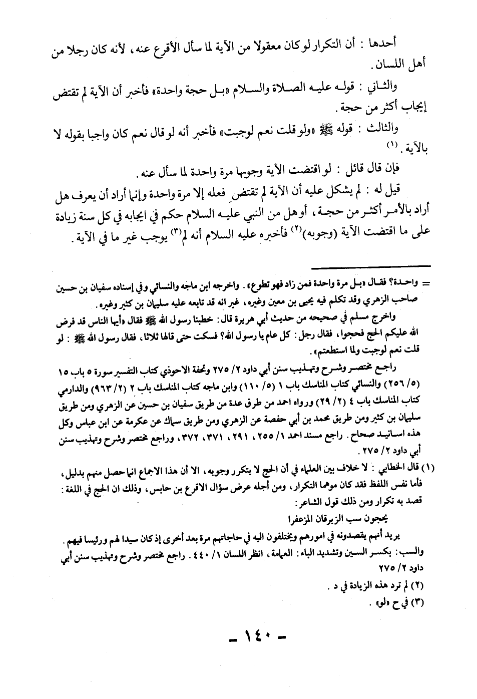 وَالثَّانِي: قَوْلُهُ - عَلَيْهِ الصَّلَاةُ وَالسَّلَامُ - " بَلْ حَجَّةً وَاحِدَةً " فَأَخْبَرَ أَنَّ الْآيَةَ لَمْ تَقْتَضِ إيجَابَ أَكْثَرَ مِنْ حَجَّةٍ.