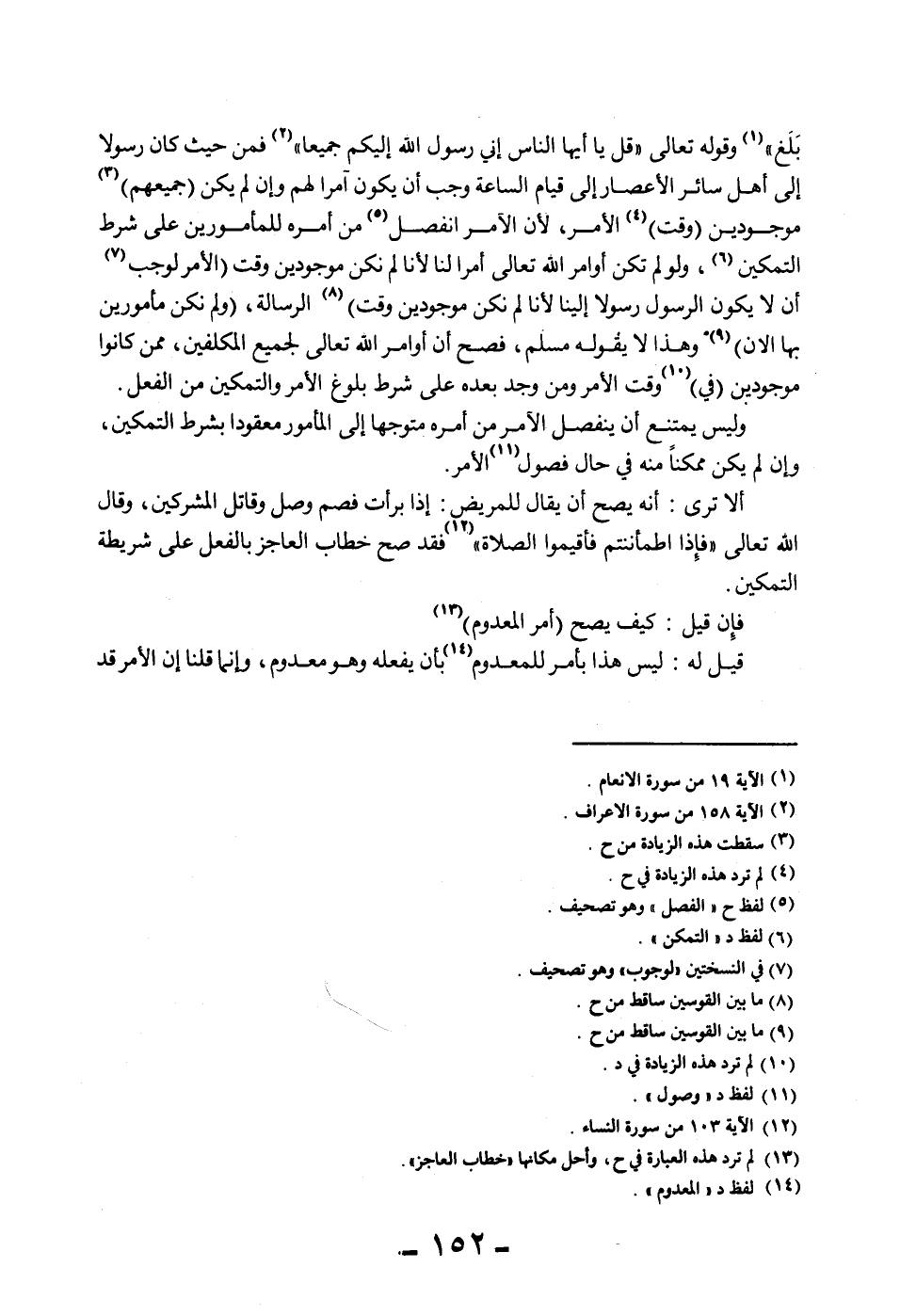 بَلَغَ} [الأنعام: 19] وقَوْله تَعَالَى {قُلْ يَا أَيُّهَا النَّاسُ إنِّي رَسُولُ اللَّهِ إلَيْكُمْ جَمِيعًا} [الأعراف: 158] فَمِنْ حَيْثُ كَانَ رَسُولًا إلَى أَهْلِ سَائِرِ الْأَعْصَارِ إلَى قِيَامِ السَّاعَةِ وَجَبَ أَنْ يَكُونَ آمِرًا لَهُمْ وَإِنْ لَمْ يَكُنْ (جَمِيعَهُمْ) مَوْجُودِينَ (وَقْتَ) الْأَمْرِ، لِأَنَّ الْآمِرَ انْفَصَلَ مِنْ أَمْرِهِ لِلْمَأْمُورِينَ عَلَى شَرْطِ التَّمْكِينِ، وَلَوْ لَمْ تَكُنْ أَوَامِرُ اللَّهِ تَعَالَى أَمْرًا لَنَا لِأَنَّا لَمْ نَكُنْ مَوْجُودِينَ وَقْتَ (الْأَمْرِ لَوَجَبَ أَنْ لَا يَكُونَ الرَّسُولُ رَسُولًا إلَيْنَا لِأَنَّا لَمْ نَكُنْ مَوْجُودِينَ وَقْتَ) الرِّسَالَةِ، (وَلَمْ نَكُنْ مَأْمُورِينَ بِهَا الْآنَ) وَهَذَا لَا يَقُولُهُ مُسْلِمٌ، فَصَحَّ أَنَّ أَوَامِرَ اللَّهِ تَعَالَى لِجَمِيعِ الْمُكَلَّفِينَ، مِمَّنْ كَانُوا مَوْجُودِينَ (فِي) وَقْتِ الْأَمْرِ وَمَنْ وَجَدَ بَعْدَهُ عَلَى شَرْطِ بُلُوغِ الْأَمْرِ وَالتَّمْكِينِ مِنْ الْفِعْلِ. وَلَيْسَ يَمْتَنِعُ أَنْ يَنْفَصِلَ الْآمِرُ مِنْ أَمْرِهِ مُتَوَجِّهًا إلَى الْمَأْمُورِ مَعْقُودًا بِشَرْطِ التَّمْكِينِ، وَإِنْ لَمْ يَكُنْ مُمَكَّنًا مِنْهُ فِي حَالِ فُصُولِ الْأَمْرِ. أَلَا تَرَى: أَنَّهُ يَصِحُّ أَنْ يُقَالَ لِلْمَرِيضِ: إذَا بَرَأْت فَصُمْ وَصَلِّ وَقَاتِلْ الْمُشْرِكِينَ، وَقَالَ اللَّهُ تَعَالَى {فَإِذَا اطْمَأْنَنْتُمْ فَأَقِيمُوا الصَّلَاةَ} [النساء: 103] فَقَدْ صَحَّ خِطَابُ الْعَاجِزِ بِالْفِعْلِ عَلَى شَرِيطَةِ التَّمْكِينِ. فَإِنْ قِيلَ: كَيْفَ يَصِحُّ (أَمْرُ الْمَعْدُومِ) قِيلَ لَهُ: لَيْسَ هَذَا بِأَمْرٍ لِلْمَعْدُومِ بِأَنْ يَفْعَلَهُ وَهُوَ مَعْدُومٌ، وَإِنَّمَا قُلْنَا إنَّ الْأَمْرَ قَدْ
