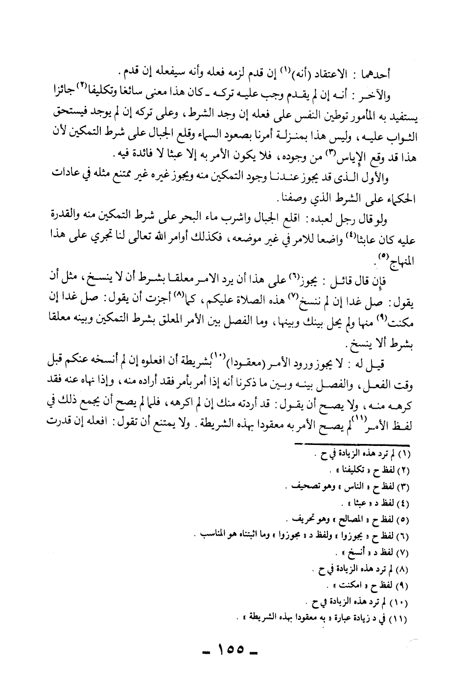 فَإِنْ قَالَ قَائِلٌ: يَجُوزُ عَلَى هَذَا أَنْ يَرِدَ الْأَمْرُ مُعَلَّقًا بِشَرْطِ أَنْ لَا يُنْسَخَ، مِثْلُ أَنْ يَقُولَ: صَلِّ غَدًا إنْ لَمْ نَنْسَخْ هَذِهِ الصَّلَاةَ عَلَيْكُمْ، كَمَا أَجَزْت أَنْ يَقُولَ: صَلِّ غَدًا إنْ مُكِّنْت مِنْهَا وَلَمْ يُحَلْ بَيْنَك وَبَيْنَهَا، وَمَا الْفَصْلُ بَيْنَ الْأَمْرِ الْمُعَلَّقِ بِشَرْطِ التَّمْكِينِ وَبَيْنَهُ مُعَلَّقًا بِشَرْطِ أَلَّا يُنْسَخَ. قِيلَ لَهُ: لَا يَجُوزُ وُرُودُ الْأَمْرِ (مَعْقُودًا) بِشَرِيطَةِ أَنْ افْعَلُوهُ إنْ لَمْ أَنْسَخْهُ عَنْكُمْ قَبْلَ وَقْتِ الْفِعْلِ، وَالْفَصْلُ بَيْنَهُ وَبَيْنَ مَا ذَكَرْنَا أَنَّهُ إذَا أَمَرَ بِأَمْرٍ فَقَدْ أَرَادَهُ مِنْهُ، وَإِذَا نَهَاهُ عَنْهُ فَقَدْ كَرِهَهُ مِنْهُ، وَلَا يَصِحُّ أَنْ يَقُولَ: قَدْ أَرَدْته مِنْك إنْ لَمْ أَكْرَهْهُ، فَلَمَّا لَمْ يَصِحَّ أَنْ يَجْمَعَ ذَلِكَ فِي لَفْظِ الْأَمْرِ لَمْ يَصِحَّ الْأَمْرُ بِهِ مَعْقُودًا بِهَذِهِ الشَّرِيطَة. وَلَا يَمْتَنِعُ أَنْ تَقُولَ: افْعَلْهُ إنْ قَدَرْت