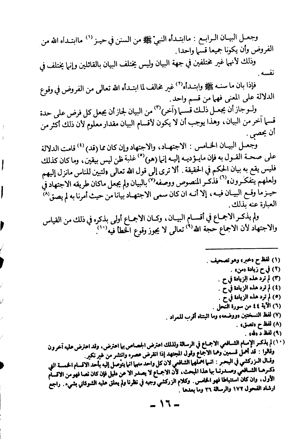 وَجَعَلَ الْبَيَانَ الْخَامِسَ: الِاجْتِهَادَ، وَالِاجْتِهَادُ وَإِنْ كَانَ مِمَّا (قَدْ) قَامَتْ الدَّلَالَةُ عَلَى صِحَّةِ الْقَوْلِ بِهِ فَإِنَّ مَا يُؤَدِّيهِ إلَيْهِ إنَّمَا (هُوَ) غَلَبَةُ ظَنٍّ لَيْسَ بِيَقِينٍ، وَمَا كَانَ كَذَلِكَ فَلَيْسَ يَقَعُ بِهِ بَيَانُ الْحُكْمِ فِي الْحَقِيقَةِ. أَلَا تَرَى إلَى قَوْلِ اللَّهِ تَعَالَى {لِتُبَيِّنَ لِلنَّاسِ مَا نُزِّلَ إلَيْهِمْ وَلَعَلَّهُمْ يَتَفَكَّرُونَ} [النحل: 44] فَذَكَرَ الْمَنْصُوصَ وَوَصَفَهُ بِالْبَيَانِ وَلَمْ يَجْعَلْ مَا كَانَ طَرِيقُهُ الِاجْتِهَادَ فِي حَيِّزِ مَا وَقَعَ الْبَيَانُ فِيهِ، إلَّا أَنَّهُ إنْ كَانَ سَمَّى الِاجْتِهَادَ بَيَانًا مِنْ حَيْثُ أُمِرْنَا بِهِ لَمْ يَسُقْ الْعِبَارَةَ عَنْهُ بِذَلِكَ. وَلَمْ يَذْكُرْ الْإِجْمَاعَ فِي أَقْسَامِ الْبَيَانِ، وَكَانَ الْإِجْمَاعُ أَوْلَى بِذِكْرِهِ فِي ذَلِكَ مِنْ الْقِيَاسِ وَالِاجْتِهَادِ لِأَنَّ الْإِجْمَاعَ حُجَّةُ اللَّهِ تَعَالَى لَا يَجُوزُ وُقُوعُ الْخَطَأِ فِيهِ.