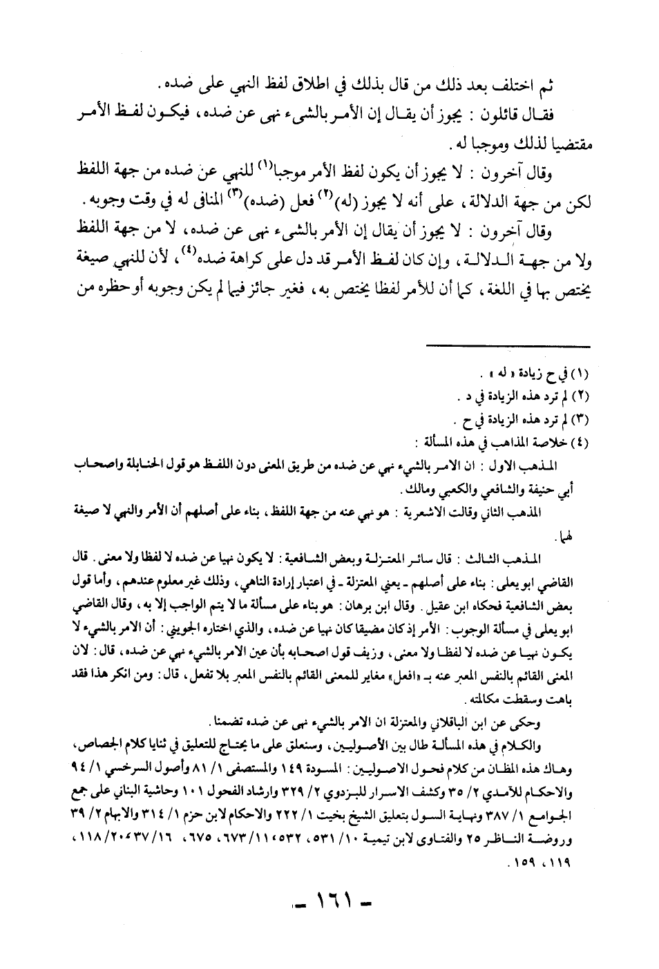ثُمَّ اخْتَلَفَ بَعْدَ ذَلِكَ مَنْ قَالَ بِذَلِكَ فِي إطْلَاقِ لَفْظِ النَّهْيِ عَلَى ضِدِّهِ. فَقَالَ قَائِلُونَ: يَجُوزُ أَنْ يُقَالَ إنَّ الْأَمْرَ بِالشَّيْءِ نَهْيٌ عَنْ ضِدِّهِ، فَيَكُونُ لَفْظُ الْأَمْرِ مُقْتَضِيًا لِذَلِكَ وَمُوجِبًا لَهُ. وَقَالَ آخَرُونَ: لَا يَجُوزُ أَنْ يَكُونَ لَفْظُ الْأَمْرِ مُوجِبًا لِلنَّهْيِ عَنْ ضِدِّهِ مِنْ جِهَةِ اللَّفْظِ لَكِنْ مِنْ جِهَةِ الدَّلَالَةِ، عَلَى أَنَّهُ لَا يَجُوزُ (لَهُ) فِعْلُ (ضِدِّهِ) الْمُنَافِي لَهُ فِي وَقْتِ وُجُوبِهِ.