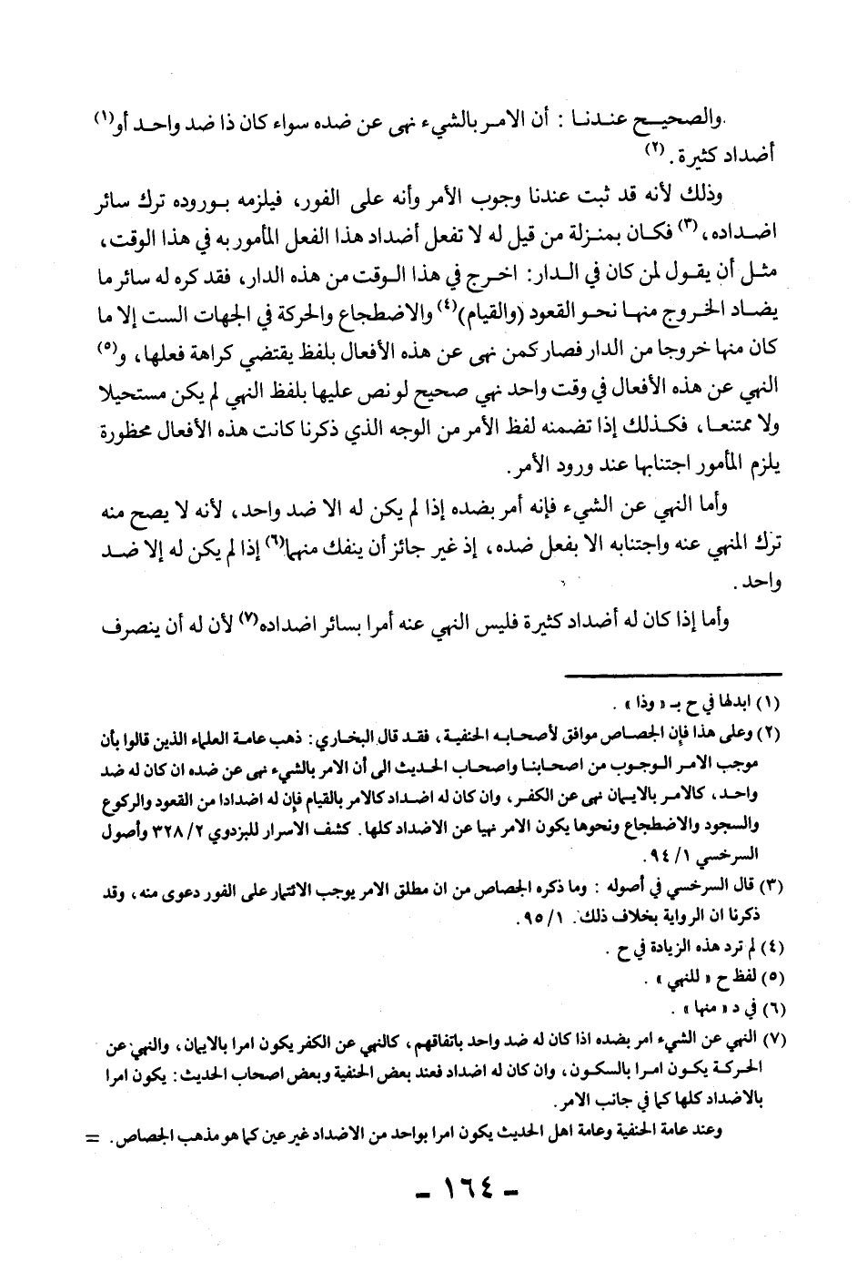 وَالصَّحِيحُ عِنْدَنَا: أَنَّ الْأَمْرَ بِالشَّيْءِ نَهْيٌ عَنْ ضِدِّهِ سَوَاءٌ كَانَ ذَا ضِدٍّ وَاحِدٍ أَوْ أَضْدَادٍ كَثِيرَةٍ. وَذَلِكَ لِأَنَّهُ قَدْ ثَبَتَ عِنْدَنَا وُجُوبُ الْأَمْرِ وَأَنَّهُ عَلَى الْفَوْرِ، فَيَلْزَمُهُ بِوُرُودِهِ تَرْكُ سَائِرِ أَضْدَادِهِ، فَكَانَ بِمَنْزِلَةِ مَنْ قِيلَ لَهُ لَا تَفْعَلْ أَضْدَادَ هَذَا الْفِعْلِ الْمَأْمُورِ بِهِ فِي هَذَا الْوَقْتِ، مِثْلُ أَنْ يَقُولَ لِمَنْ كَانَ فِي الدَّارِ: اُخْرُجْ فِي هَذَا الْوَقْتِ مِنْ هَذِهِ الدَّارِ، فَقَدْ كُرِهَ لَهُ سَائِرُ مَا يُضَادُّ الْخُرُوجَ مِنْهَا نَحْوُ الْقُعُودِ (وَالْقِيَامِ) وَالِاضْطِجَاعِ وَالْحَرَكَةِ فِي الْجِهَاتِ السِّتِّ إلَّا مَا كَانَ مِنْهَا خُرُوجًا مِنْ الدَّارِ فَصَارَ كَمَنْ نَهَى عَنْ هَذِهِ الْأَفْعَالِ بِلَفْظٍ يَقْتَضِي كَرَاهَةَ فِعْلِهَا، وَالنَّهْيُ عَنْ هَذِهِ الْأَفْعَالِ فِي وَقْتٍ وَاحِدٍ نَهْيٌ صَحِيحٌ لَوْ نَصَّ عَلَيْهَا بِلَفْظِ النَّهْيِ لَمْ يَكُنْ مُسْتَحِيلًا وَلَا مُمْتَنِعًا، فَكَذَلِكَ إذَا تَضَمَّنَهُ لَفْظُ الْأَمْرِ مِنْ الْوَجْهِ الَّذِي ذَكَرْنَا كَانَتْ هَذِهِ الْأَفْعَالُ مَحْظُورَةً يَلْزَمُ الْمَأْمُورَ اجْتِنَابُهَا عِنْدَ وُرُودِ الْأَمْرِ.