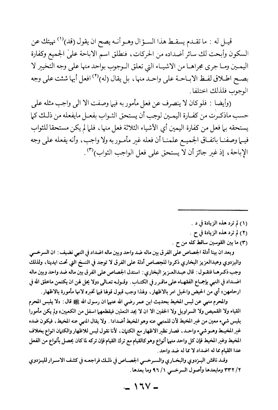 قِيلَ لَهُ: مَا تَقَدَّمَ يُسْقِطُ هَذَا السُّؤَالَ وَهُوَ أَنَّهُ يَصِحُّ أَنْ يَقُولَ (قَدْ) نَهَيْتُك عَنْ السُّكُونِ وَأَبْحَثُ لَك سَائِرَ أَضْدَادِهِ مِنْ الْحَرَكَاتِ، فَنُطْلِقُ اسْمَ الْإِبَاحَةِ عَلَى الْجَمِيعِ، وَكَفَّارَةُ الْيَمِينِ وَمَا جَرَى مَجْرَاهَا مِنْ الْأَشْيَاءِ الَّتِي تَعَلَّقَ الْوُجُوبُ بِوَاحِدٍ مِنْهَا عَلَى وَجْهِ التَّخْيِيرِ لَا يَصِحُّ إطْلَاقُ لَفْظِ الْإِبَاحَةِ عَلَى وَاحِدٍ مِنْهَا، بَلْ يُقَالُ (لَهُ) افْعَلْ أَيَّهَا شِئْت عَلَى وَجْهِ الْوُجُوبِ فَلِذَلِكَ اخْتَلَفَا.