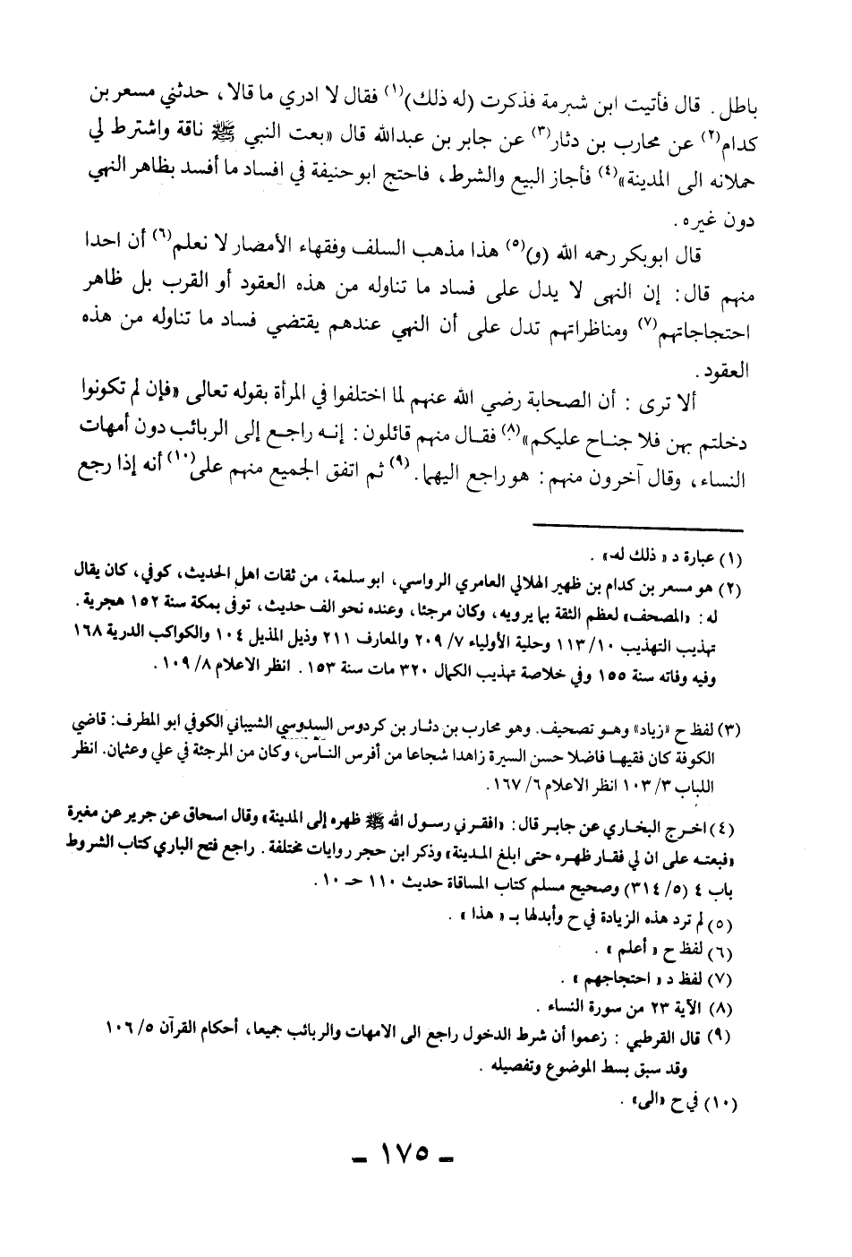 قَالَ أَبُو بَكْرٍ - رَحِمَهُ اللَّهُ - (وَ) هَذَا مَذْهَبُ السَّلَفِ وَفُقَهَاءِ الْأَمْصَارِ لَا نَعْلَمُ أَنَّ أَحَدًا مِنْهُمْ قَالَ: إنَّ النَّهْيَ لَا يَدُلُّ عَلَى فَسَادِ مَا تَنَاوَلَهُ مِنْ هَذِهِ الْعُقُودِ أَوْ الْقُرَبِ بَلْ ظَاهِرُ احْتِجَاجَاتِهِمْ وَمُنَاظَرَاتِهِمْ تَدُلُّ عَلَى أَنَّ النَّهْيَ عِنْدَهُمْ يَقْتَضِي فَسَادَ مَا تَنَاوَلَهُ مِنْ هَذِهِ الْعُقُودِ. أَلَا تَرَى: أَنَّ الصَّحَابَةَ - رَضِيَ اللَّهُ عَنْهُمْ - لَمَّا اخْتَلَفُوا فِي الْمَرْأَةِ بِقَوْلِهِ تَعَالَى {فَإِنْ لَمْ تَكُونُوا دَخَلْتُمْ بِهِنَّ فَلَا جُنَاحَ عَلَيْكُمْ} [النساء: 23] فَقَالَ مِنْهُمْ قَائِلُونَ: إنَّهُ رَاجِعٌ إلَى الرَّبَائِبِ دُونَ أُمَّهَاتِ النِّسَاءِ، وَقَالَ آخَرُونَ مِنْهُمْ: هُوَ رَاجِعٌ إلَيْهِمَا. ثُمَّ اتَّفَقَ الْجَمِيعُ مِنْهُمْ عَلَى أَنَّهُ إذَا رَجَعَ